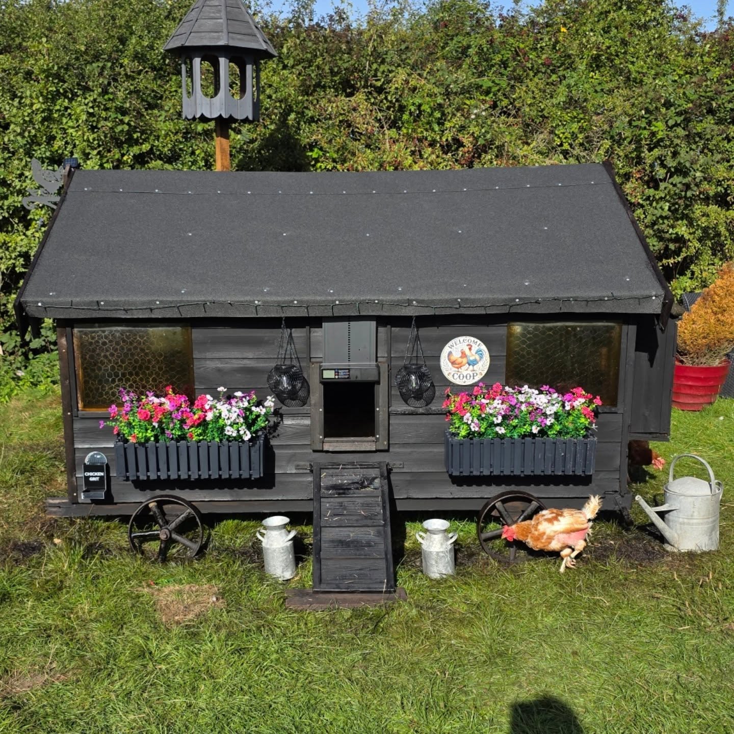 This little chicken coop looks like it came out of a fairy tale. The wood is painted a deep charcoal, making it stand out against the vibrant green grass. Bright pops of color from flower boxes add charm and a welcoming feel.