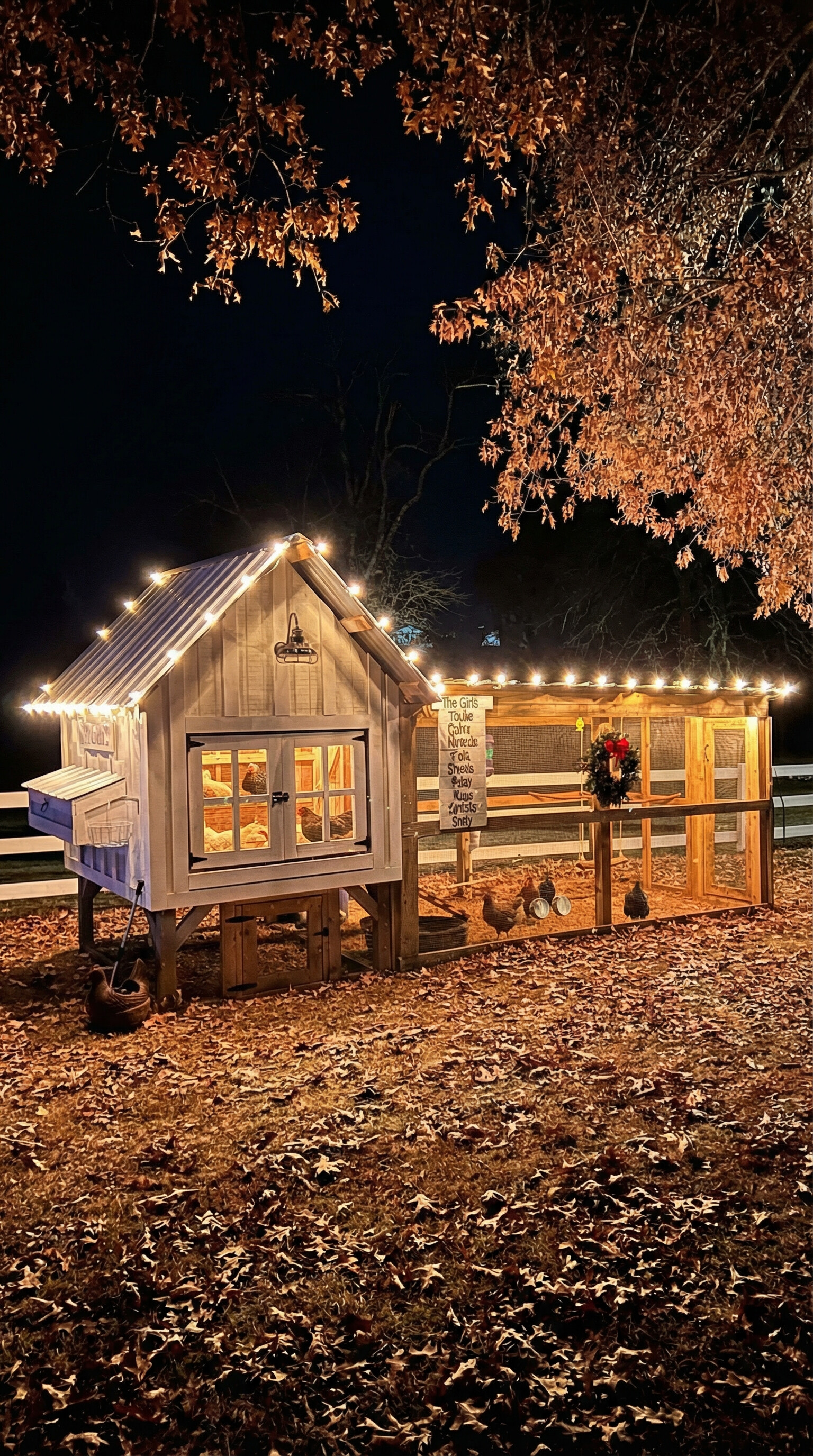 Warm lights drape along the roof of a charming little chicken coop. The soft glow spills out onto the leafy ground, creating a welcoming spot in the dark. Inside, chickens are perched comfortably, peeking through the clear windows. The coop’s rustic design blends perfectly with the autumn setting, surrounded by bare tree branches.