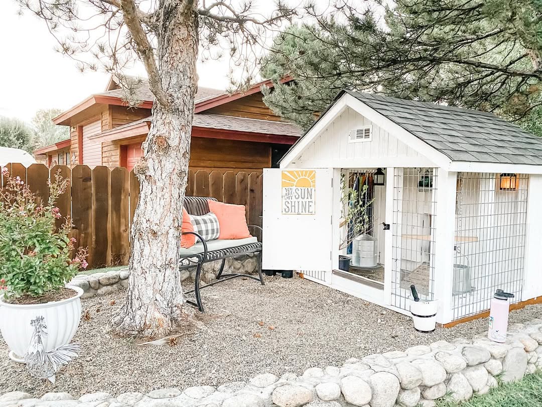 Bright and inviting, this backyard setup makes use of a compact but charming chicken coop. The structure is painted a crisp white with a simple design that fits well against the natural surroundings. A sign with the words ‘You Are My Sunshine’ adds a cheerful touch to the facade.