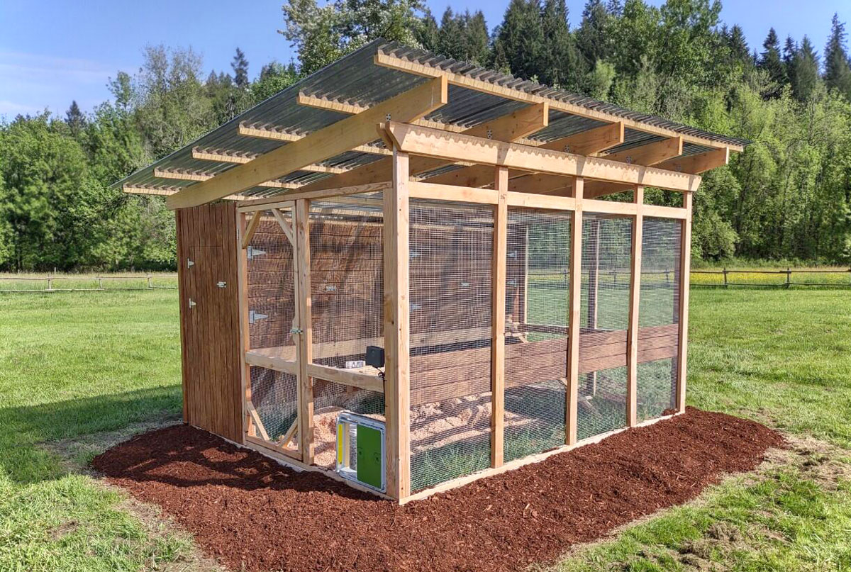Tall trees surround the scene, providing a natural backdrop. Nestled on the grass, a chicken coop takes center stage. The roof of the coop has solar panels, hinting at an eco-friendly setup.
