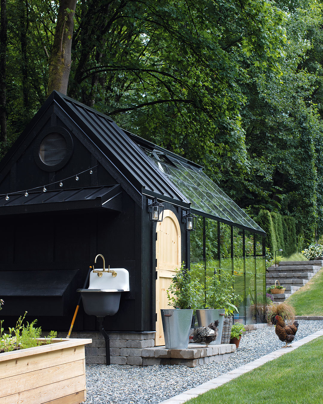 A bold black greenhouse stands in stark contrast to the lush greenery around it. The sleek metal roof and glass walls add a modern touch, while the natural wood door softens the look a bit. Next to the door, an old-fashioned sink attached under a simple brass faucet is both functional and stylish.