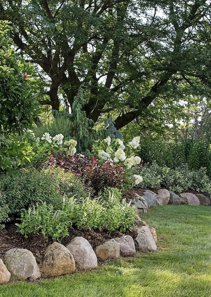 A gentle curve of smooth, gray stones separates the lush lawn from a vibrant flower bed. The stones create a natural border, guiding your eye along the landscape without being overpowering. The combination of greens and earth tones gives the garden a very organic and calming feel.