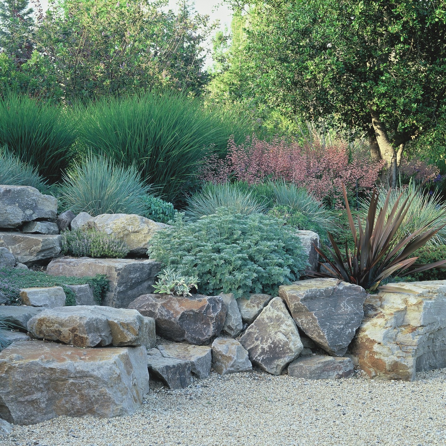 Rugged stones of various shapes and sizes create a natural, terraced look. They form a sturdy base that contrasts with the soft greenery around. The mix of browns and grays adds a rustic feel that makes the garden visually grounded.