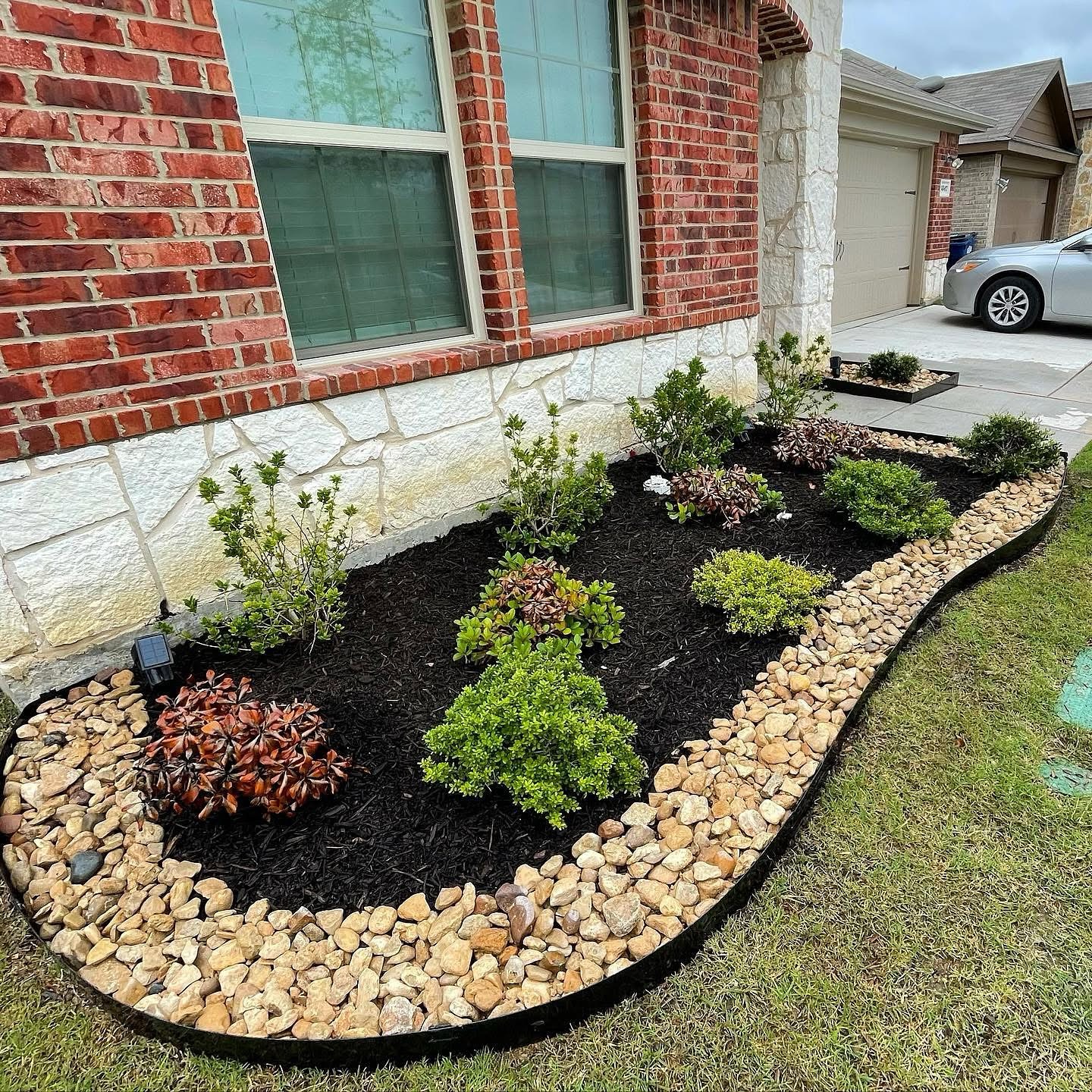 Smooth pebbles form a tidy border, adding texture and contrast to the dark mulch. Their color complements the grass edging, making the whole setup look crisp and clean. It feels organized but still has enough variety to catch the eye.