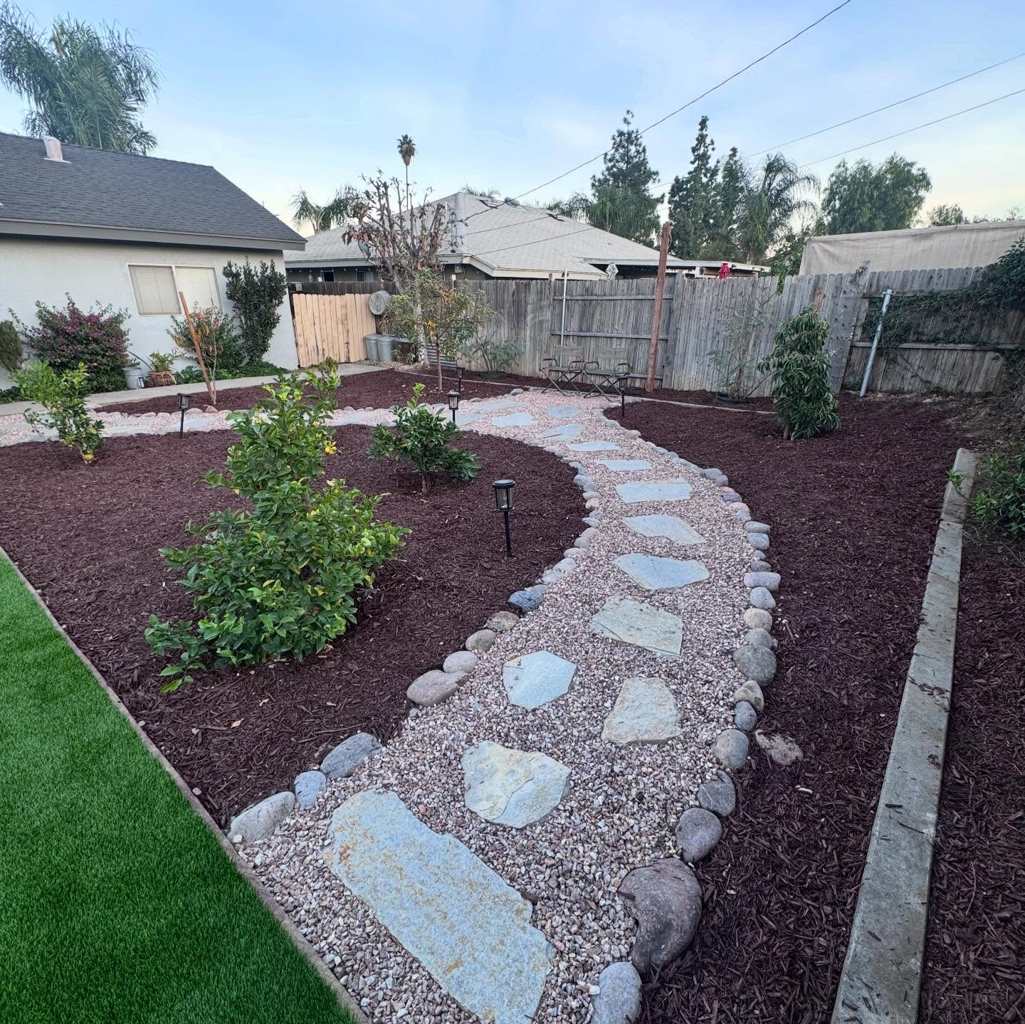 A winding stone pathway cuts through the backyard, leading your eyes past tidy garden beds. Smooth, large flagstones sit amidst smaller pebbles, bordered by a neat line of river rocks. Each turn feels intentional, guiding you smoothly from one side to the other.