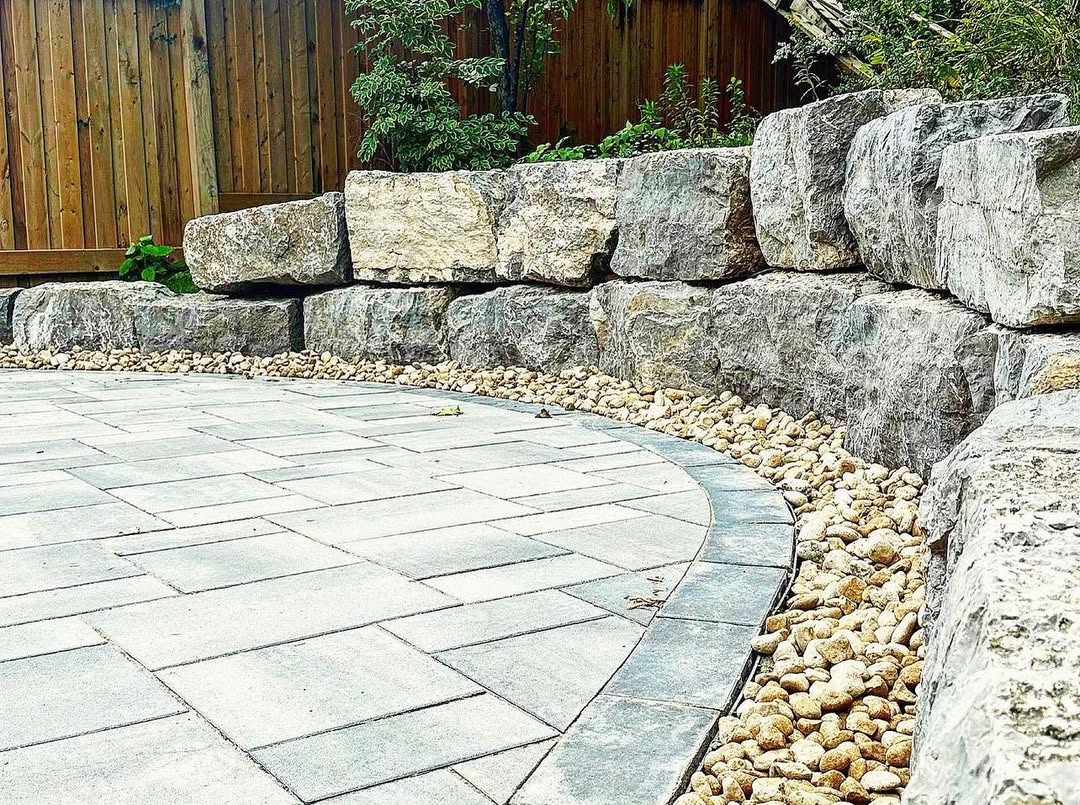 Rough, natural stones form a sturdy retaining wall, giving the space a rustic touch. They’re stacked neatly, creating a clear division between the paved area and the lush greenery beyond. The wood fence adds a warm, natural backdrop that complements the stone’s rugged texture.