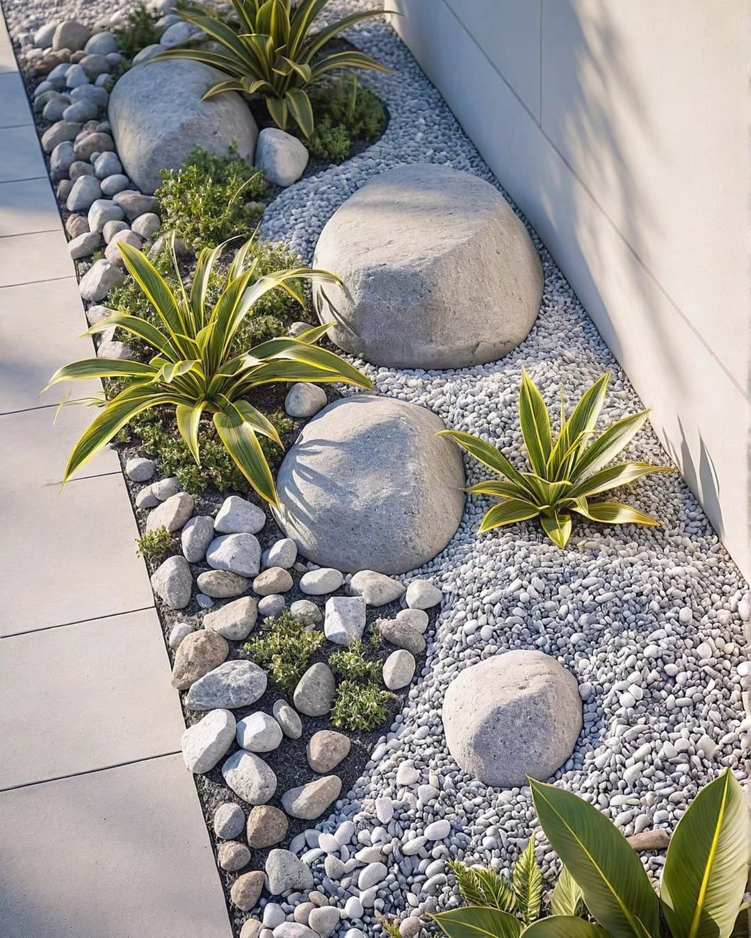 Lush green plants with bold yellow stripes peek up from a bed of smooth pebbles. The scene is punctuated by large, rounded boulders that add weight and focus. It’s a mix of organic shapes and structured lines that gives a modern, serene feel.