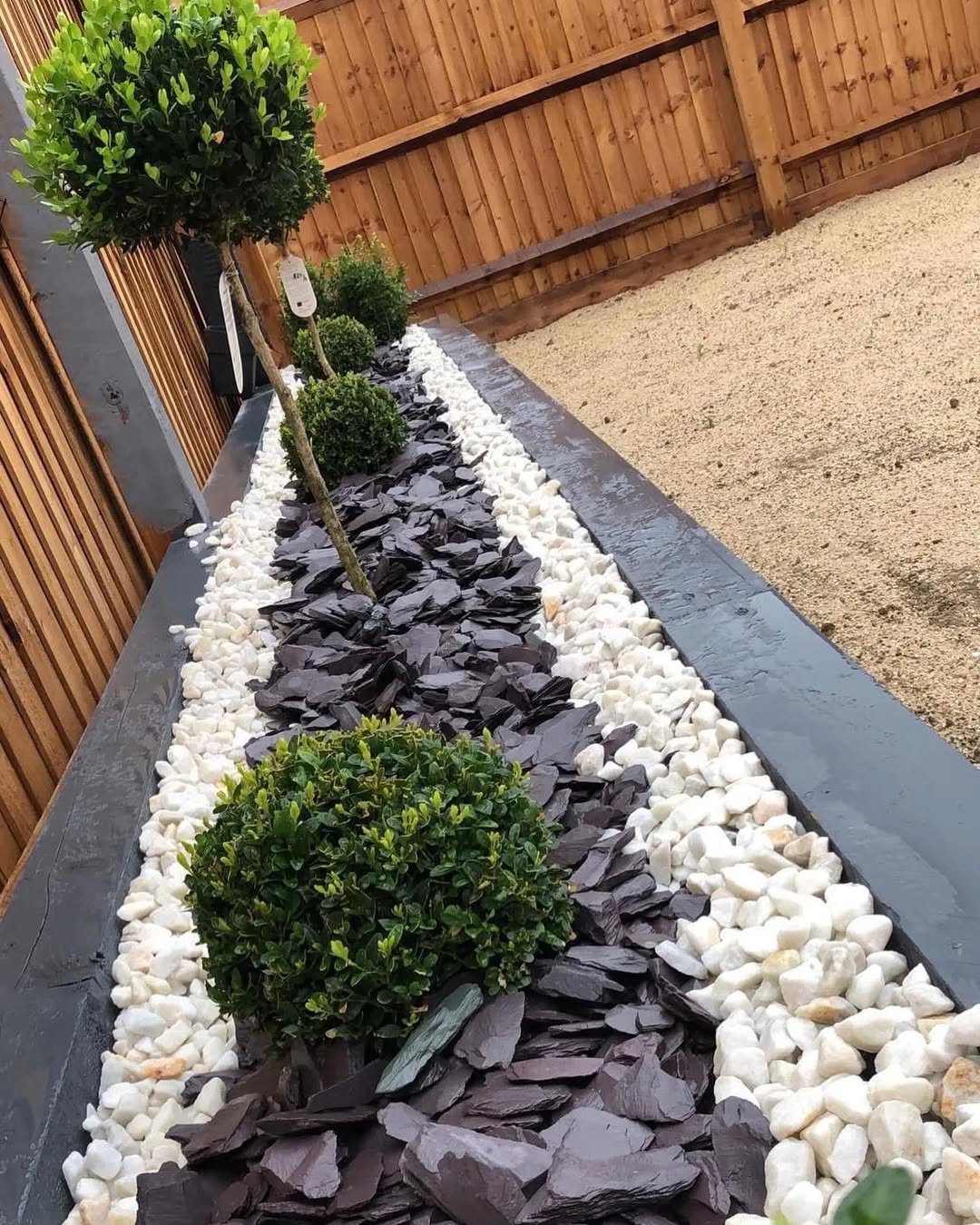 The mix of greenery and stones grabs your attention right away. A row of neatly trimmed topiary adds a formal touch alongside the sleek stones. The dark mulch contrasts sharply with the clean white pebbles, creating a striking appearance.