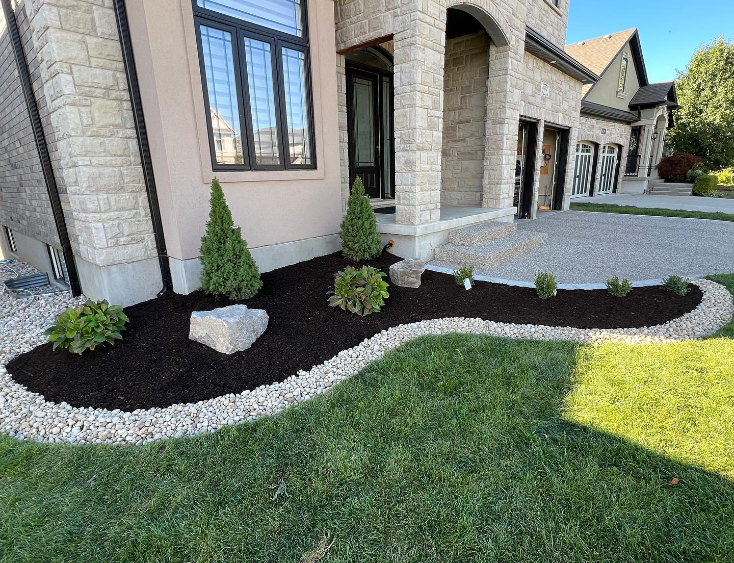 Curved white stones border the garden, adding a neat contrast against the rich dark mulch. Two small evergreen trees stand like sentinels near the house, with a couple of decorative rocks nestled among them. Between the trees, lush green plants break up the space with different textures and shades.