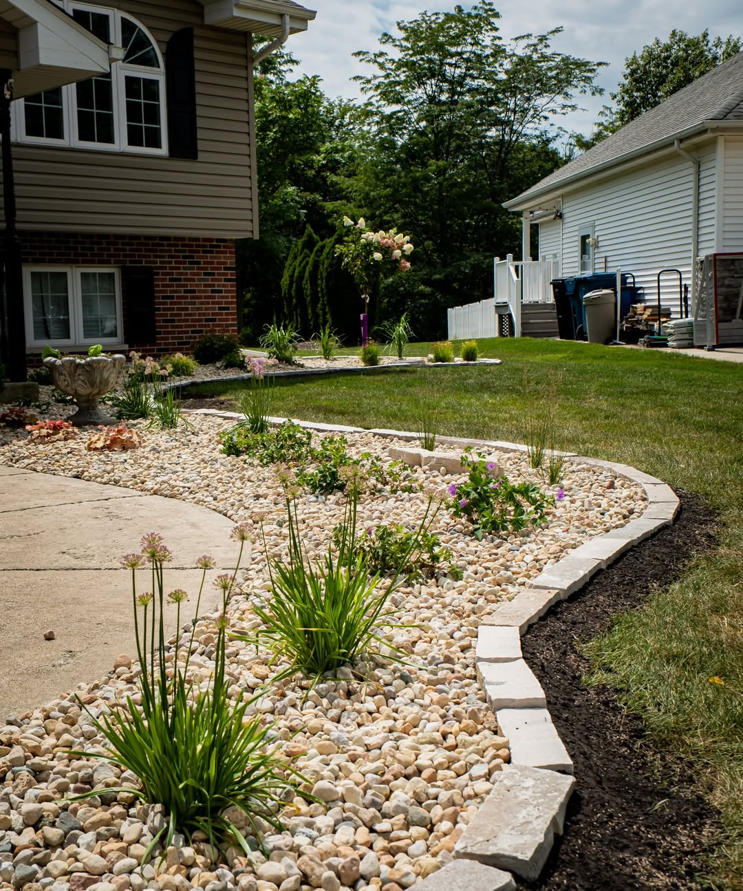 The grass sits lush and green, providing a vibrant frame for the landscaping. There’s something satisfying about the smooth transition from pebbles to mulch to grass. It’s a low-maintenance but stylish approach to front yard design, perfect for those who prefer simplicity with a touch of flair.