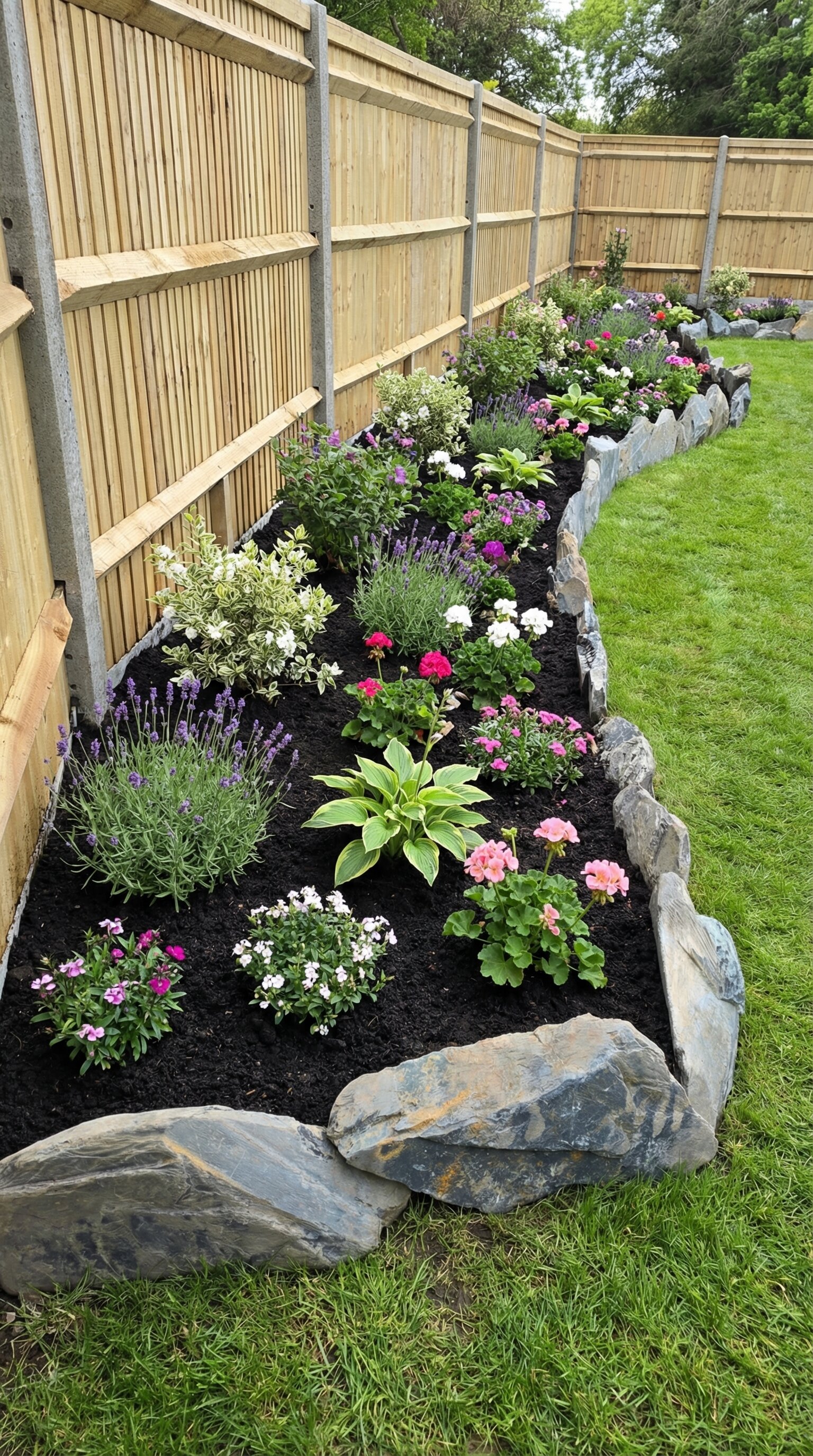 The wooden fence sets a warm backdrop, with its clean, vertical slats giving the space an orderly feeling. A stone border curves smoothly along the lively flower bed. This adds a nice contrast between the natural stones and the vibrant plants.