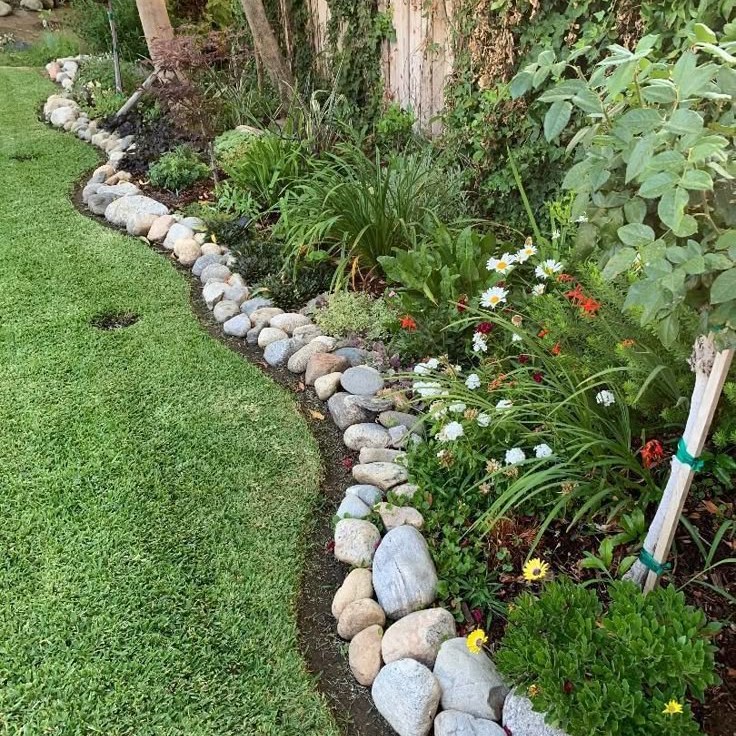 Green plants peek over from behind the stones, adding a lively contrast. The grass meets the rock border with a clean finish, making it easy to maintain. This setup keeps the garden neat while giving plants room to shine.