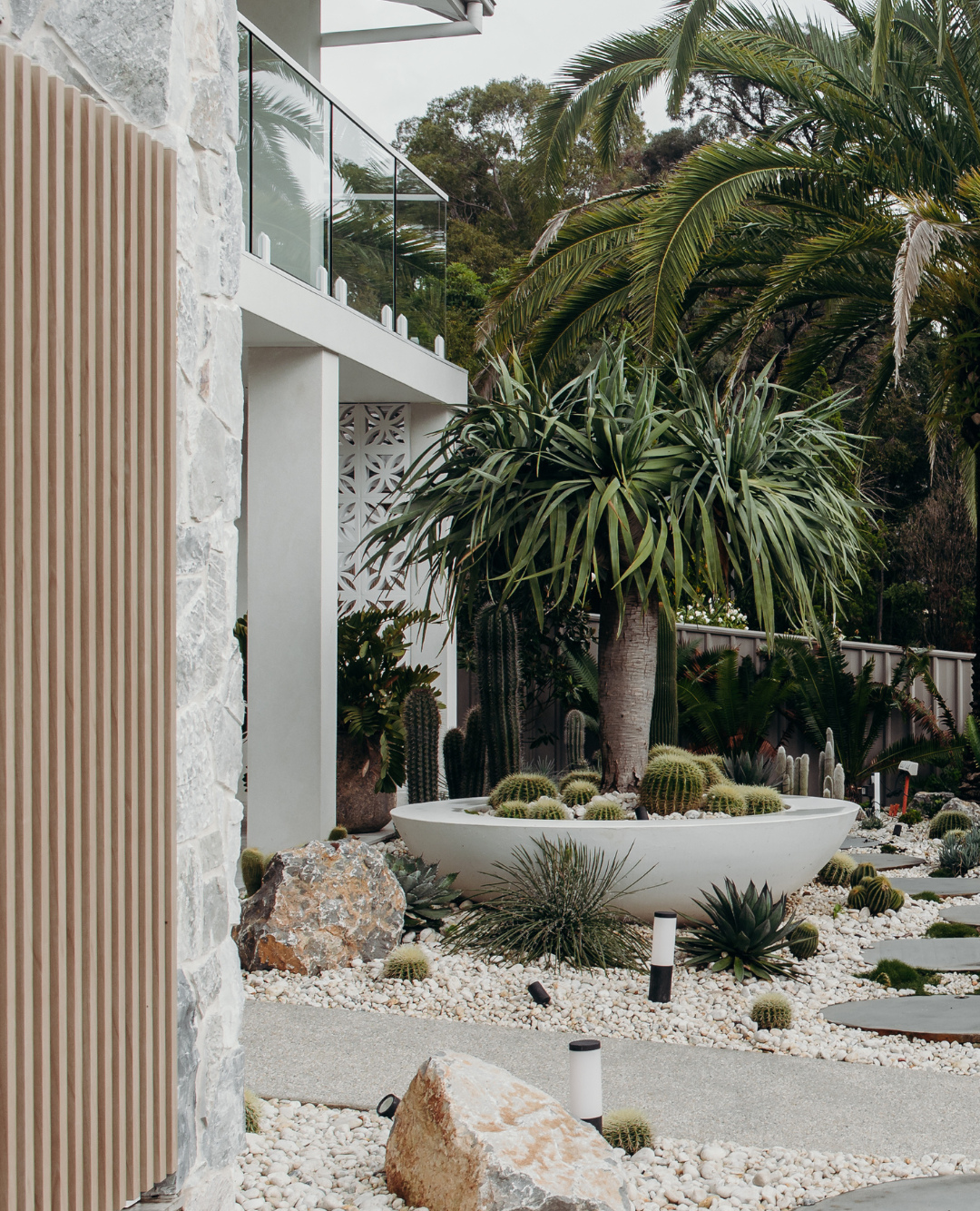 A large white planter full of cacti and succulents grabs attention right away. It’s surrounded by smooth pebbles and circular stepping stones, creating a sleek and tidy look. The use of rocks and scattered greenery adds texture and visual interest, breaking up the uniformity of the stones.
