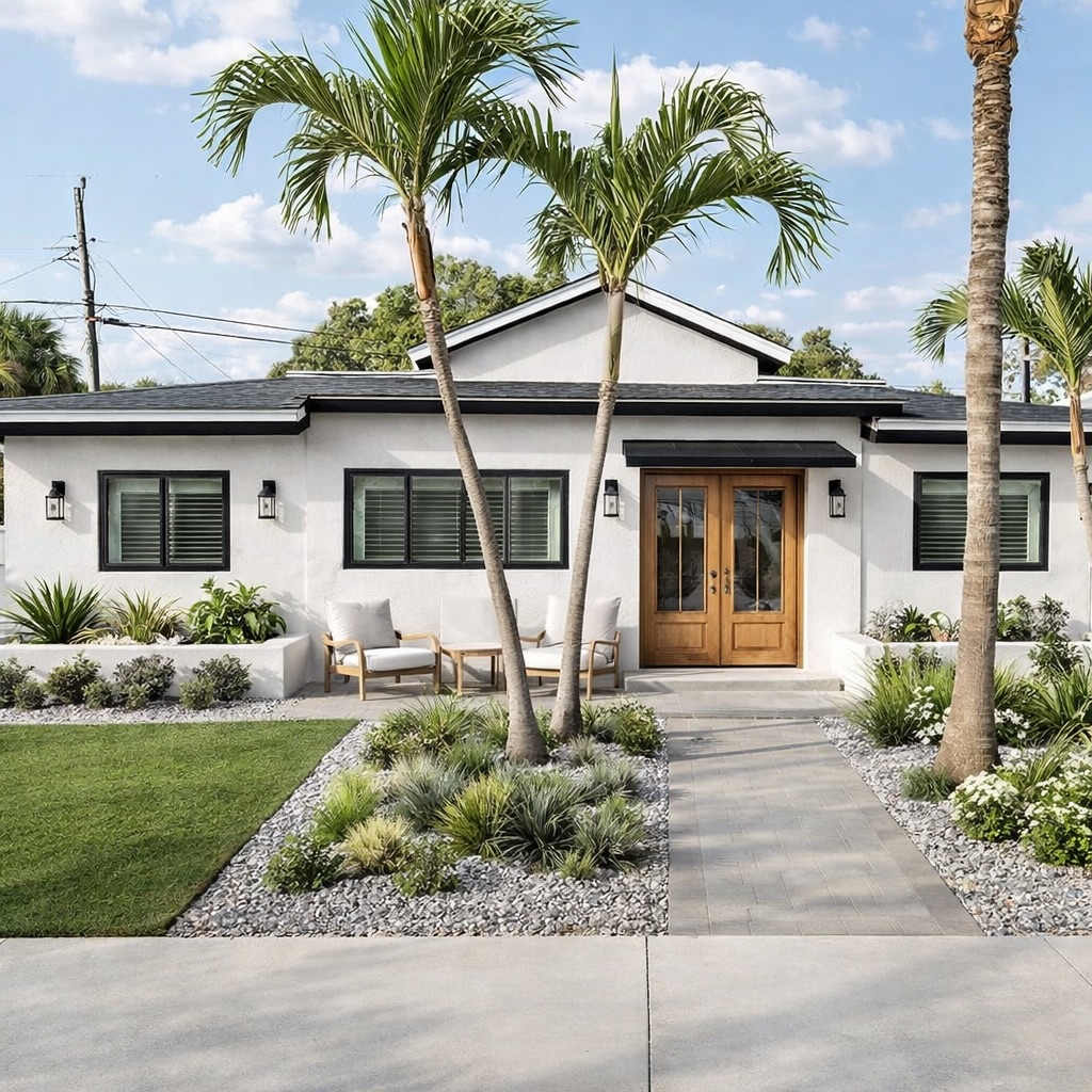 Tall palm trees frame the entrance, giving a tropical edge that’s hard to miss. The landscaping is a mix of stone, grass, and low-maintenance greenery, lending a tidy and modern feel. It’s a practical choice for those who prefer a stylish, yet easy-to-manage yard.