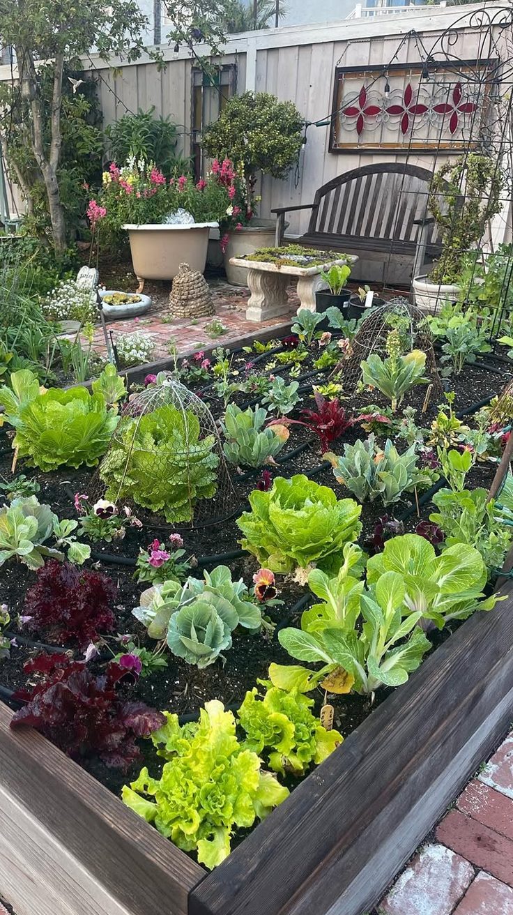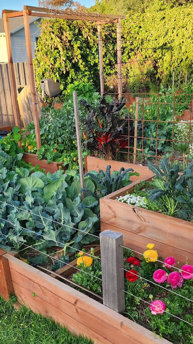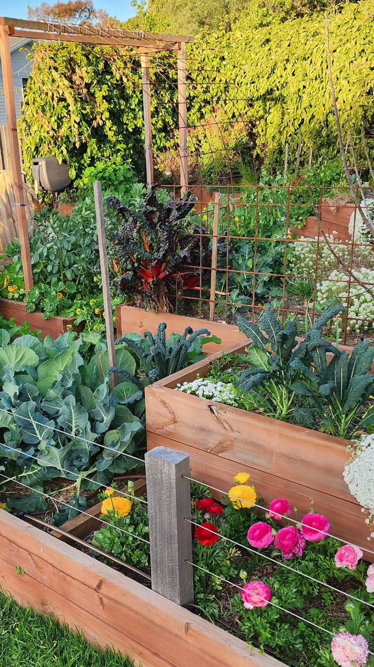 Bright greens catch your eye with lush cabbage leaves sprawling across tidy wooden raised beds. The contrasting colorful flowers pop, adding a cheerful touch that pairs perfectly with the vibrant vegetables growing nearby.