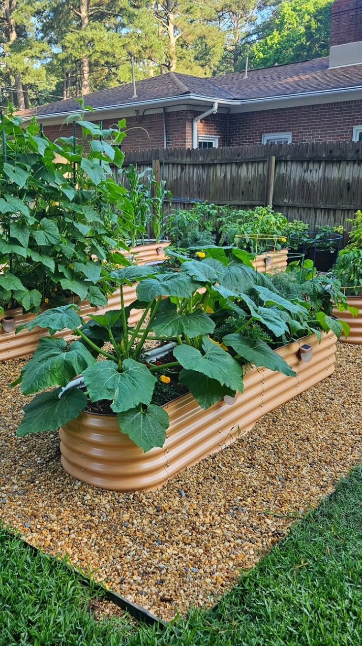 Check out those lush, green leaves sprawling over the raised garden bed. The plants look healthy and vibrant, with big leaves that hint at a thriving vegetable patch. The rich, earthy browns of the corrugated metal bed contrast nicely with the vivid greens, making everything pop visually.