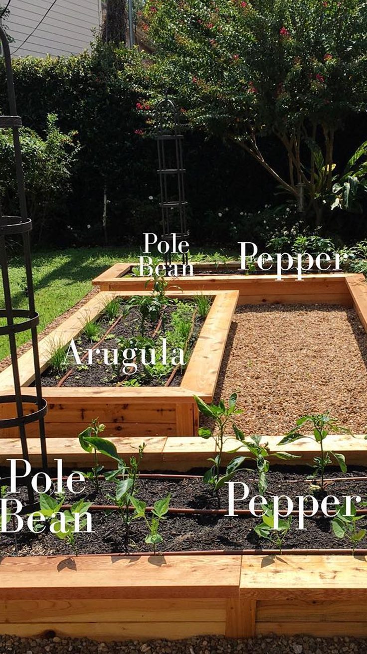 Check out these neat, raised garden beds set against a backdrop of lush greenery. Each bed is bordered with smooth wooden planks that look freshly installed. In the left bed, young pole beans are starting their climb, while arugula is peeking up through the soil with its distinctive leaves.