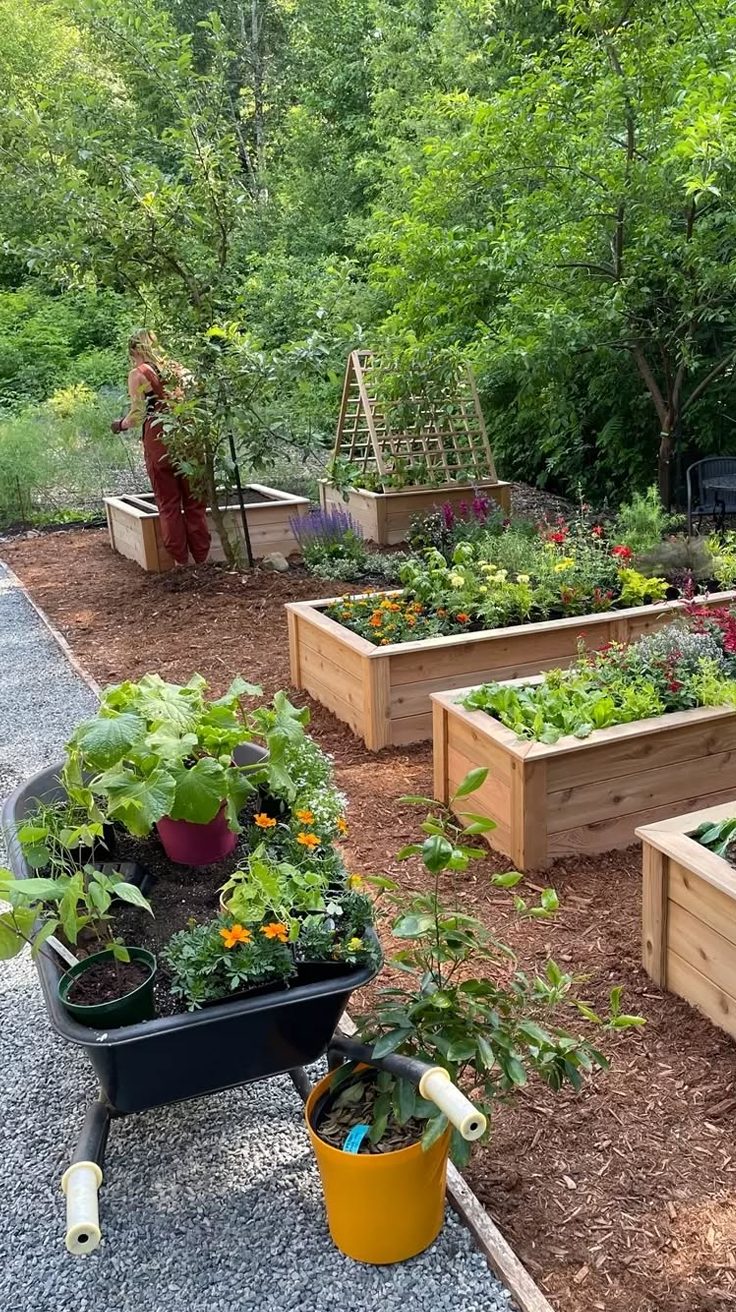 Raised garden beds and a wheelbarrow brimming with plants make a vibrant and organized scene. Bright yellow and orange flowers pop against the greenery, surrounded by well-tended soil and wood edges. It’s the kind of setup that invites you to dig in and enjoy cultivating your own space.
