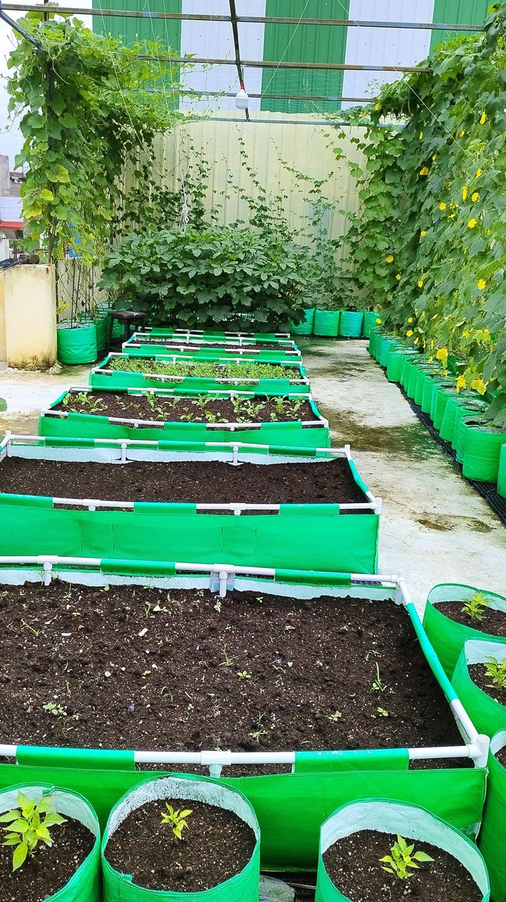 A sturdy frame stands tall, hinting at the space’s potential for climbing plants. The setup feels organized and practical, making the most of the available area without appearing cramped.