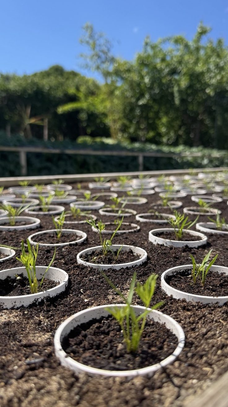 The clear blue sky above suggests a perfect day, with sunlight illuminating the young leaves. In the background, you can see a blur of dense, green foliage, adding to the lush vibe. This setup is perfect for anyone starting a garden, making it easy to care for each sprout individually.