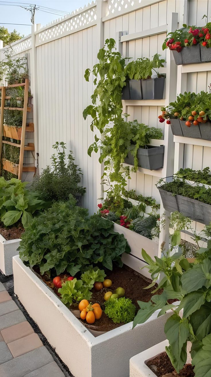 Raised planters spill over with leafy greens and ripe tomatoes, drawing the eye immediately. A white fence serves as a backdrop, enhancing the lushness of the garden. Vertical shelves hold pots of herbs and strawberries, maximizing the use of space.