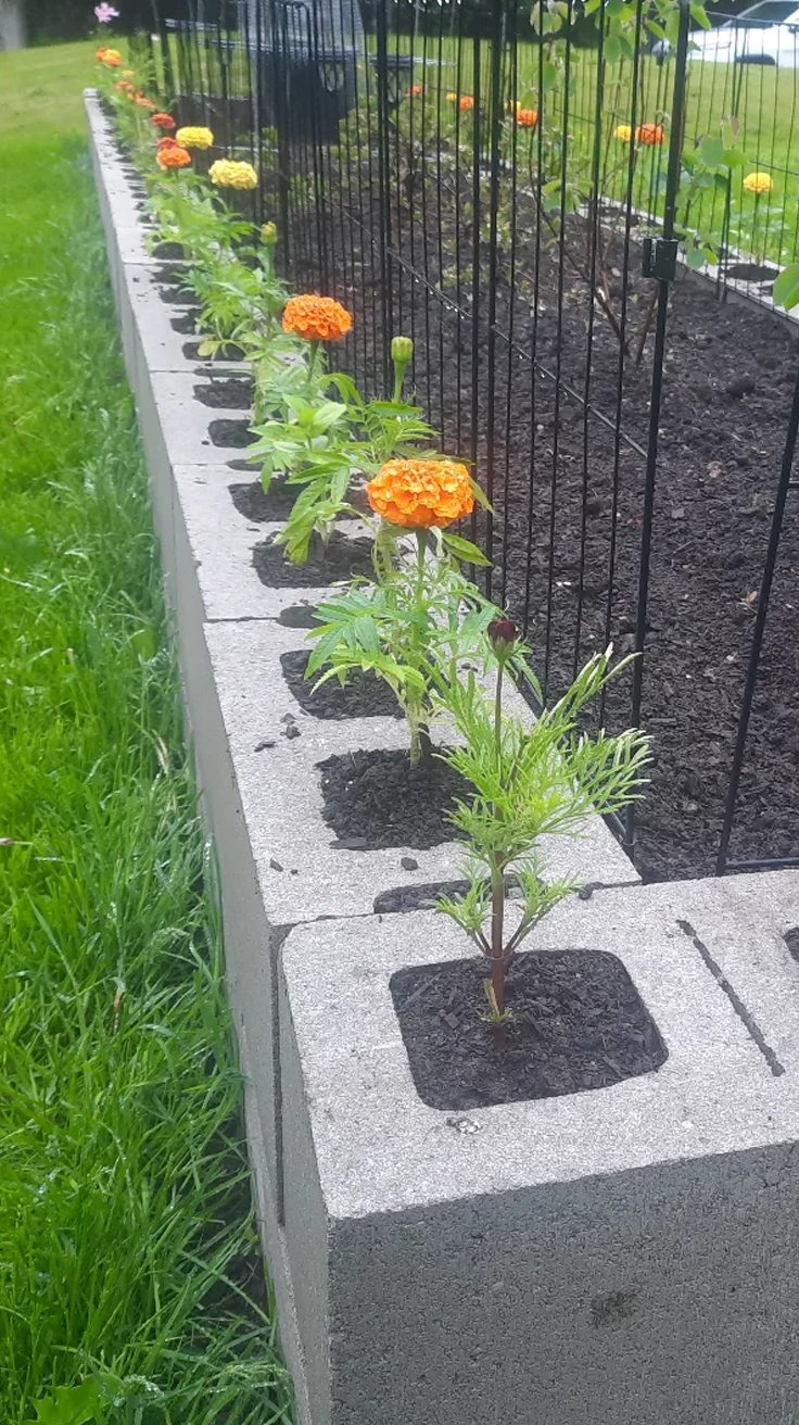 Bright marigolds peek out from neatly arranged cinder blocks, adding vibrant color along the garden edge.