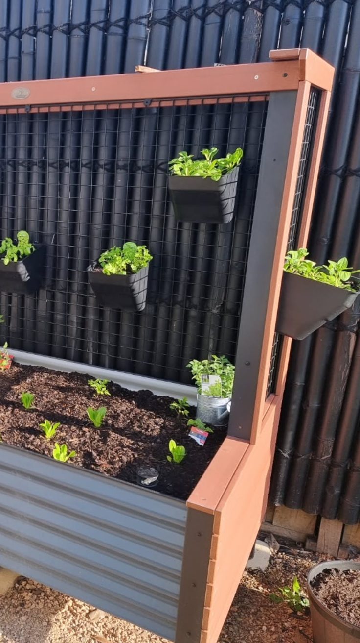 You see a tidy, organized vertical garden setup against a dark backdrop. The combination of a metal frame with wooden framing gives it a sleek and modern look. Hanging planters with fresh green leaves are cleverly attached to a grid, maximizing space and sunlight exposure.