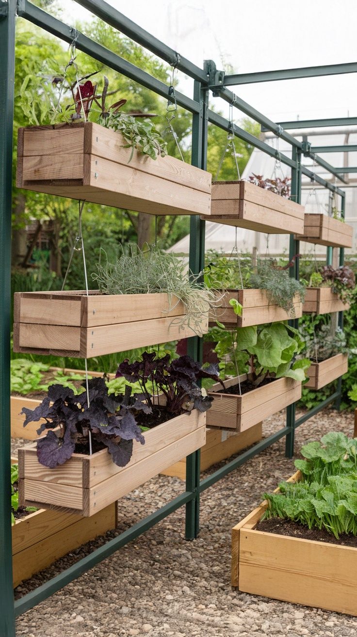 Wooden planter boxes hang suspended, creating a clean and organized garden space. They’re filled with different greenery, giving a lush and vibrant look against the wooden texture. The metal framework holding them is painted a subtle green that blends into the background, framing the plants nicely.