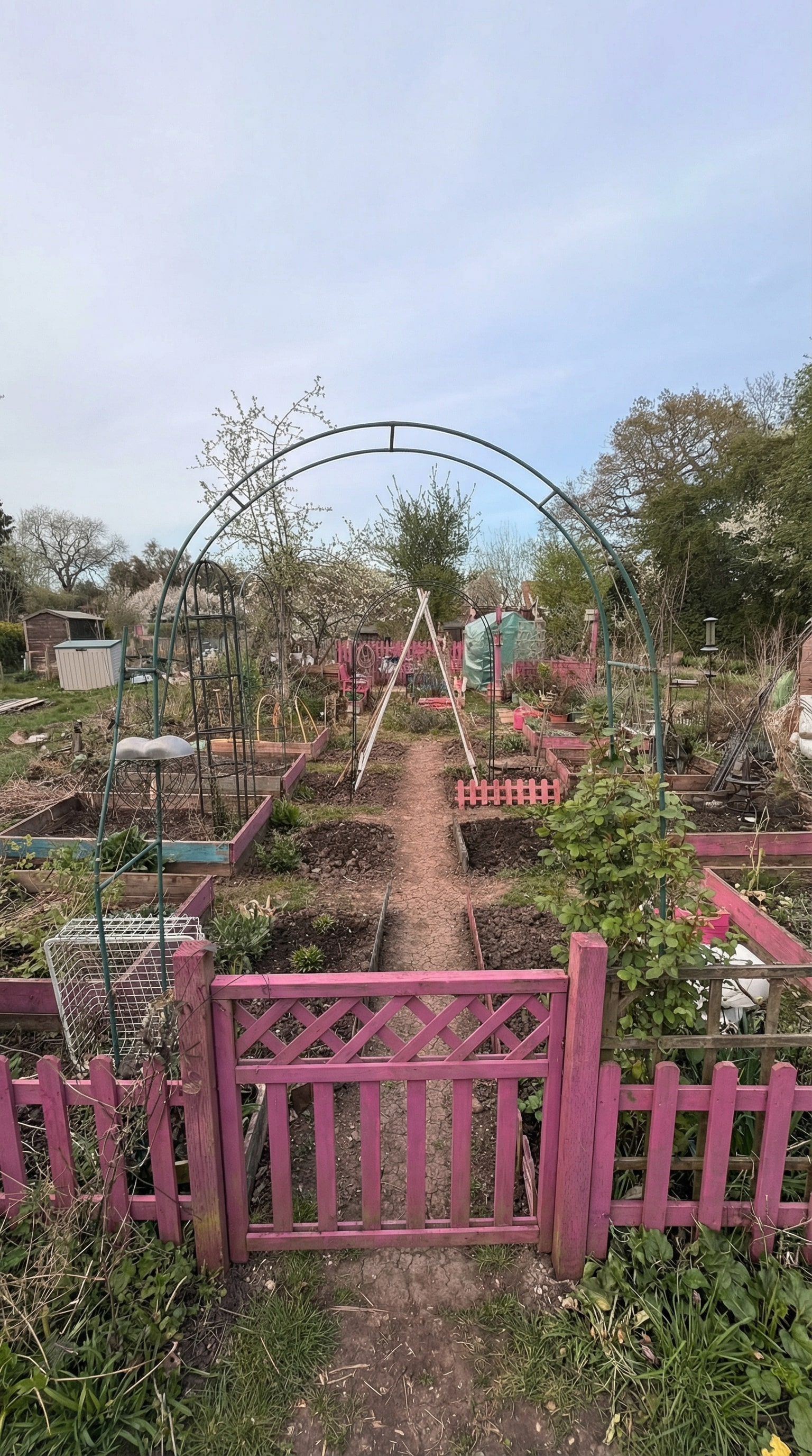 Bright pink fencing frames this charming garden, immediately catching your eye. The path leads through an archway made of metal, giving a sense of openness and space. Raised garden beds line the path, filled with rich soil ready for planting.