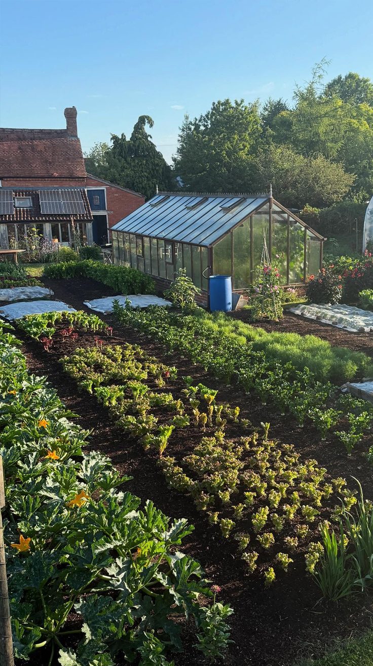 A greenhouse stands prominently, its glass panels glinting in the sunshine. It feels like the heart of the garden, offering a place for nurturing delicate plants. Nearby, solar panels on a red-brick house punctuate the scene, adding a touch of modernity to this lush, green paradise.