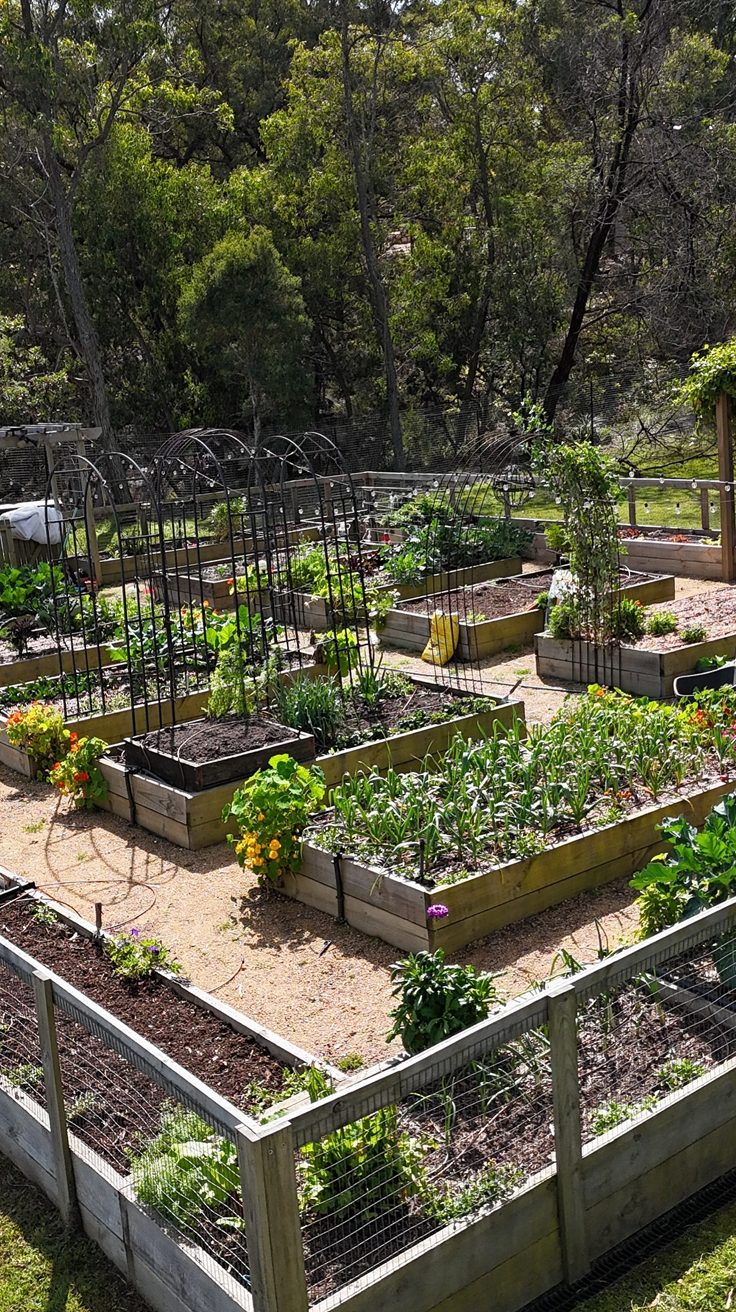 It’s a spot where time seems to slow down, letting you enjoy the simple pleasure of growing food. Tall trees stretch out above, adding a leafy backdrop to this green sanctuary. The overall vibe is relaxed yet purposeful, with every element playing its part in the garden’s ecosystem.