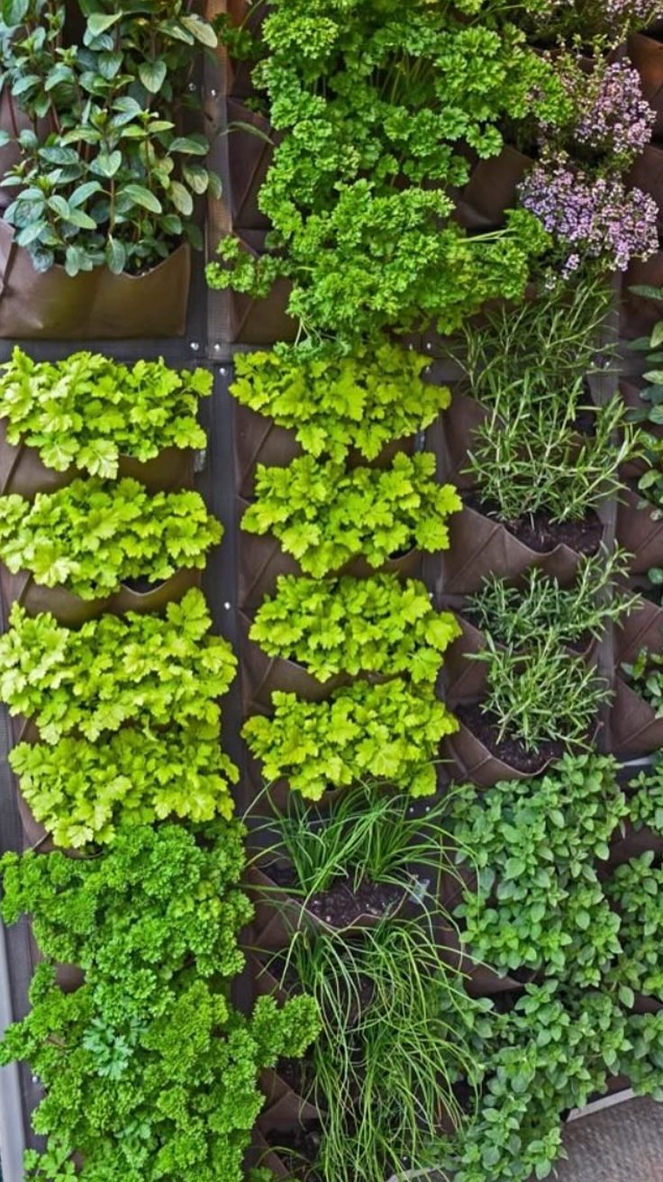 Lush green leaves cascade down the wall, creating a vibrant vertical garden. The arrangement is a mix of various herbs, with everything from curly parsley to mint. This setup takes a small space and turns it into a lush green tapestry, perfect for anyone looking to grow fresh ingredients without a traditional garden.