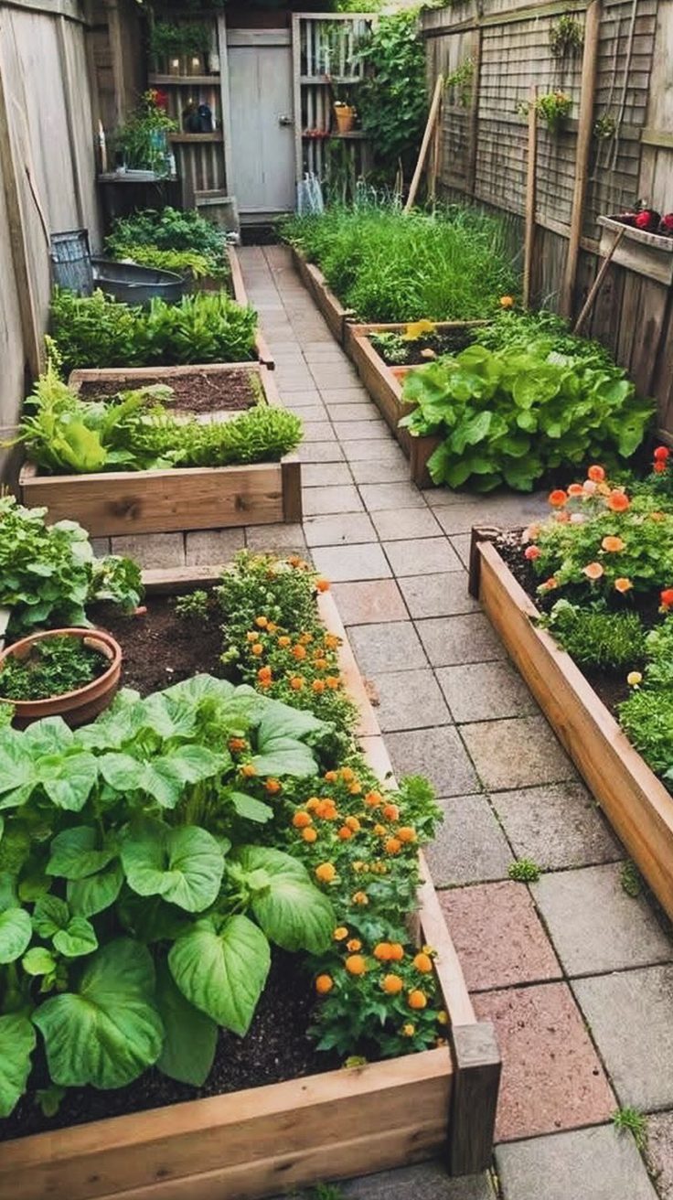 Rows of thriving greenery fill the backyard, framed by neat wooden raised beds. Bright orange flowers add pops of color, contrasting with the lush greens of leafy vegetables. The beds are arranged along a stone-paved path, offering easy access and a tidy appearance.