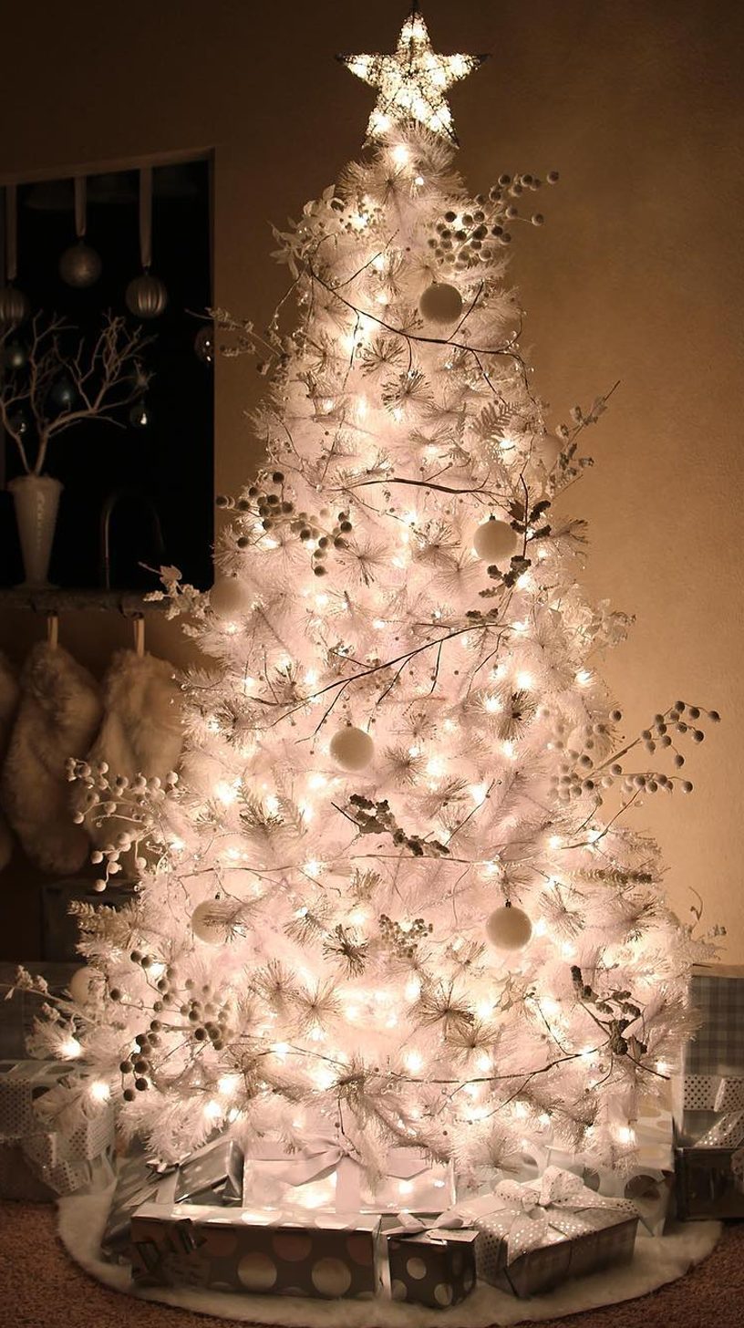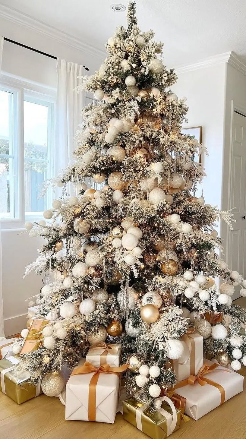 Soft, frosted white branches give the tree a snowy, peaceful look. It’s packed with ornaments in shades of white, ivory, and gold, creating a monochrome, elegant vibe. Warm lights peek through the branches, adding a cozy glow in contrast to the cool tones.