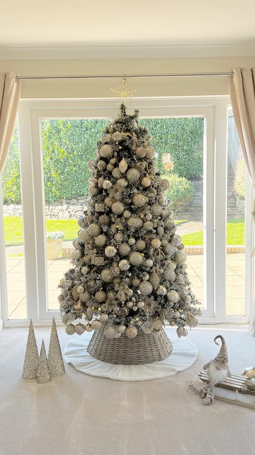 Golden and silver ornaments completely blanket the tree and give it a polished, elegant look. It’s topped with a simple, glowing star that’s both understated and eye-catching. The tree sits in a woven basket base with a white cloth underneath, keeping the setup neat and cohesive.