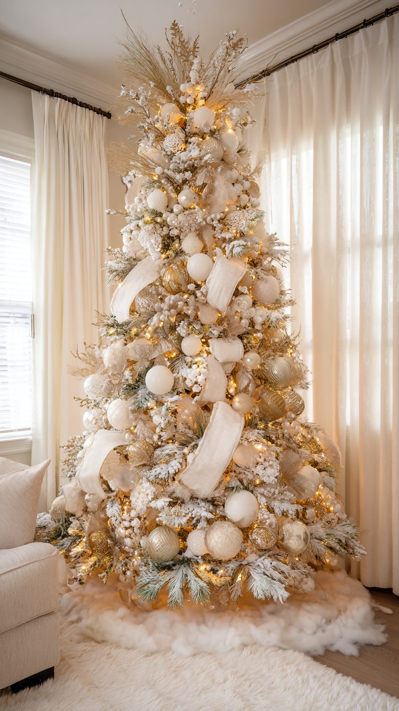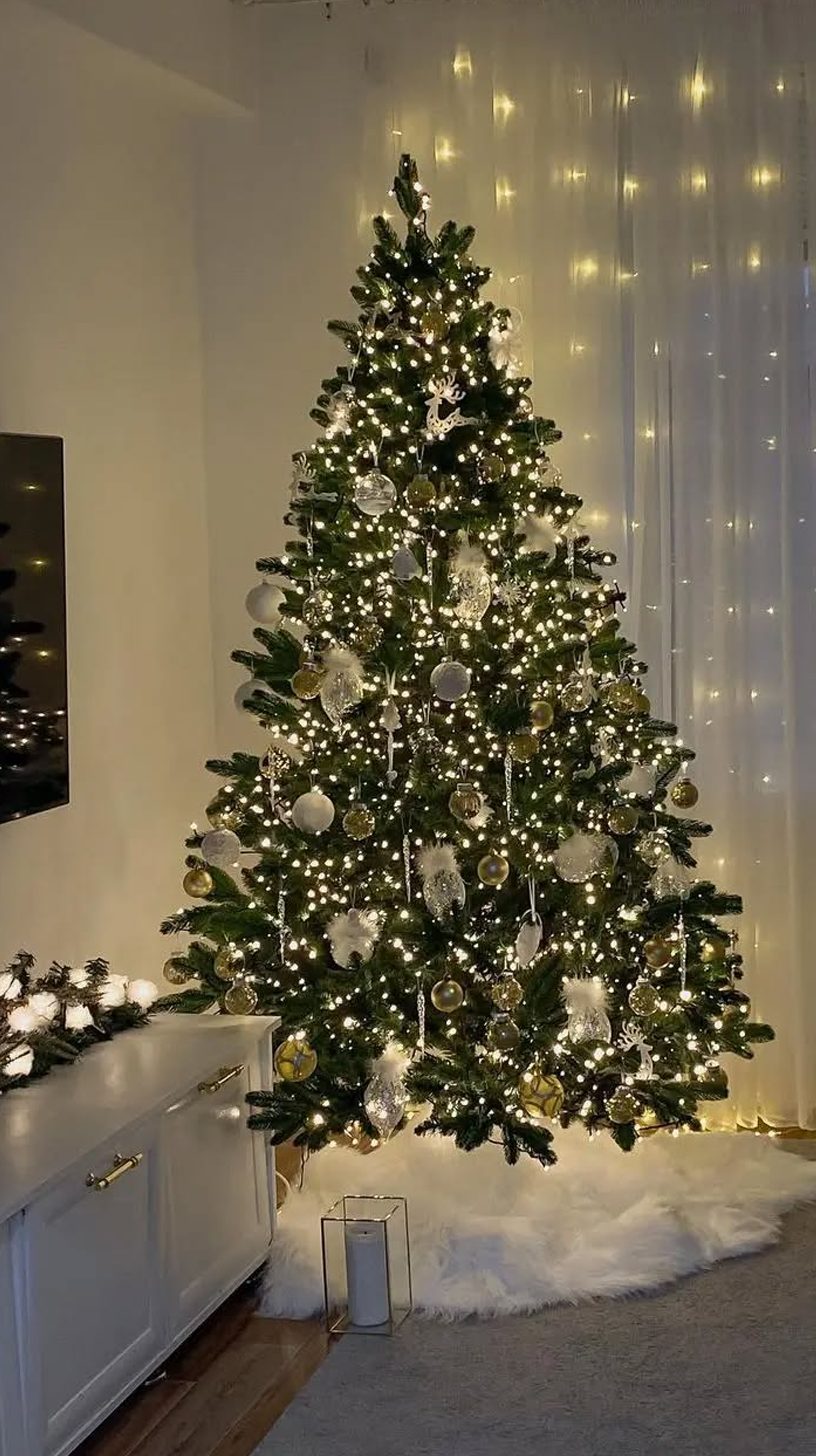 Ornaments in metallic gold, silver, and white give the tree a clean, modern vibe. The fluffy white base adds a cozy touch and blends seamlessly with the subtle white curtain backdrop. Everything feels curated yet inviting.