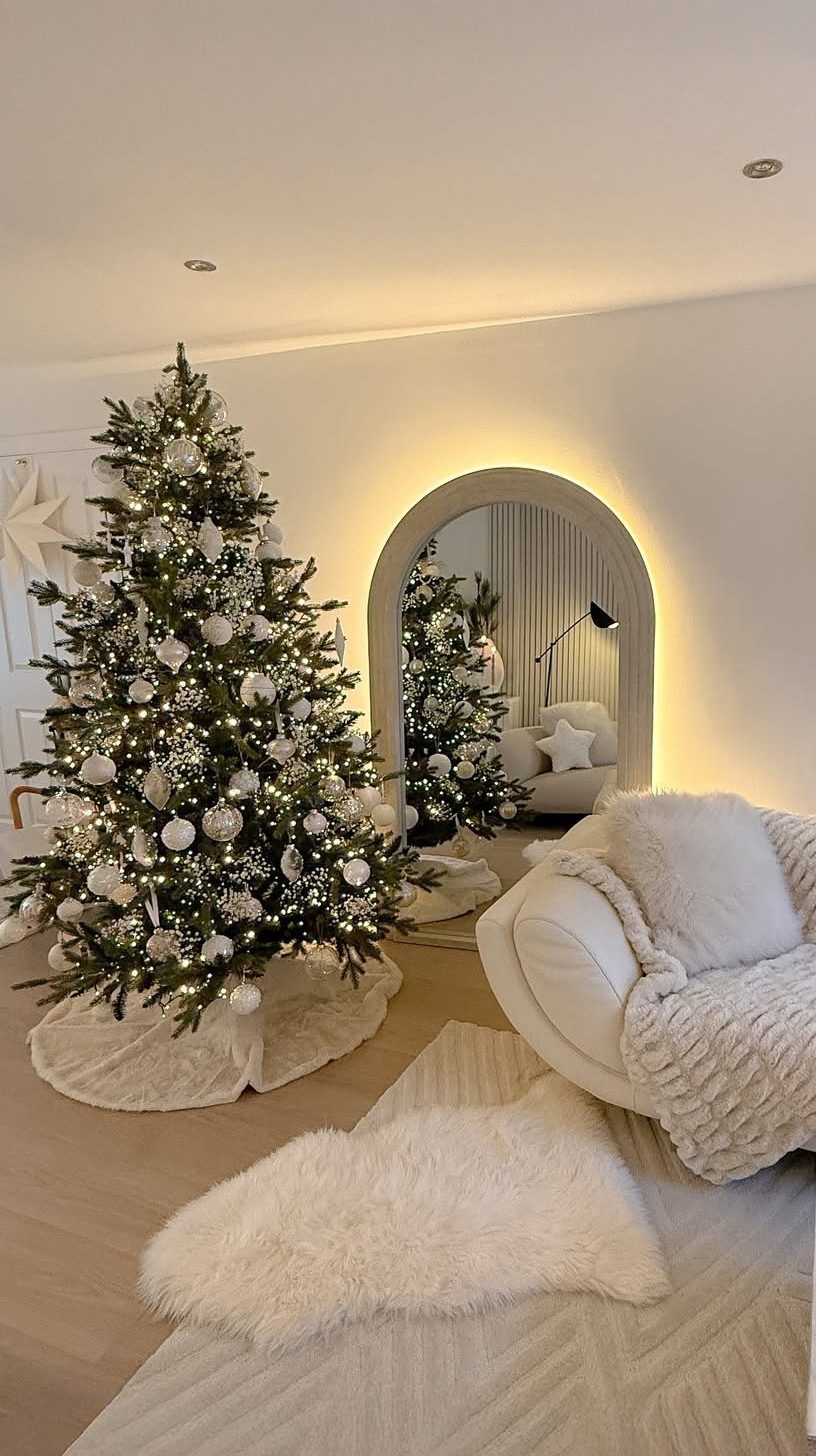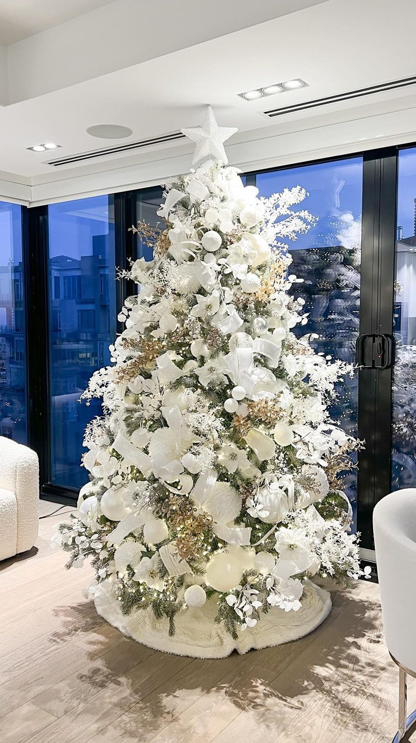 The Christmas tree is a frosted centerpiece, glowing with delicate warm lights and soft ribbons. Its white and silver decorations feel timeless and clean, standing tall next to large windows that let in natural light to brighten the space.