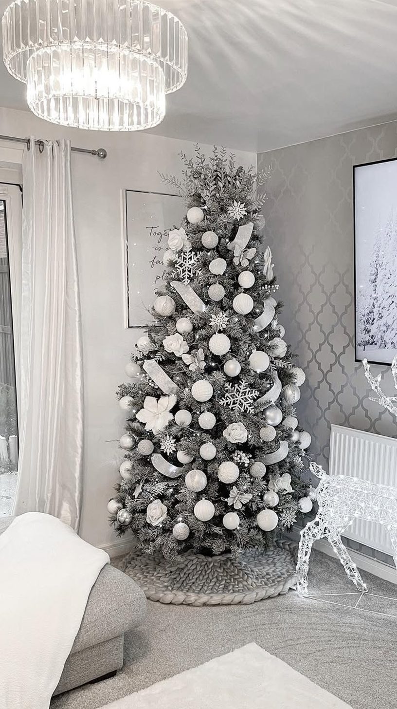 The ornaments stick to a clean, monochromatic palette. White bulbs, frosted garlands, and delicate snow-inspired accents cover the tree. A metallic touch here and there adds just enough sparkle without overpowering the icy theme.