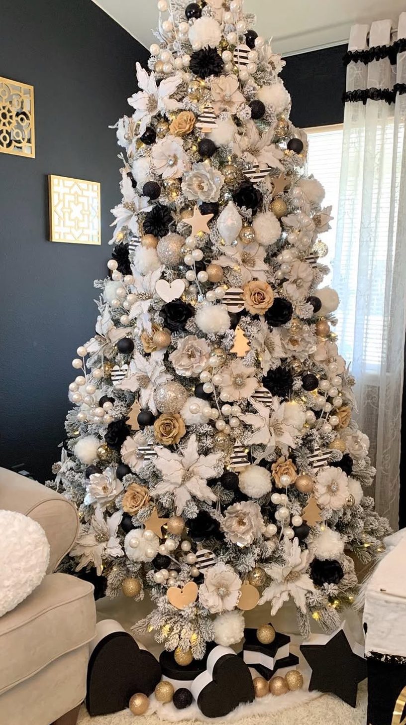 The tree immediately catches your eye with its bold mix of black, white, and gold. The flocked branches provide a frosty backdrop that highlights the contrasting colors of the ornaments. It’s layered with oversized white flowers, glittery gold accents, and matte black elements that give it a luxurious yet modern look.