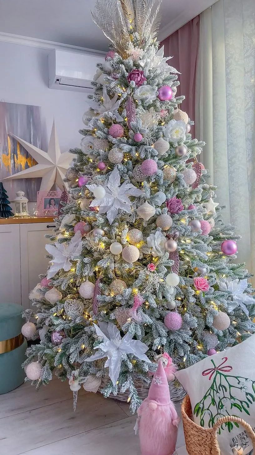 Frosted branches give this Christmas tree a dreamy, snowy look. The icy appearance is balanced with soft pastel ornaments in pinks, whites, and golds, making the entire setup feel elegant and airy. Oversized white flowers and delicate feathers near the top add texture and lift your gaze upward.
