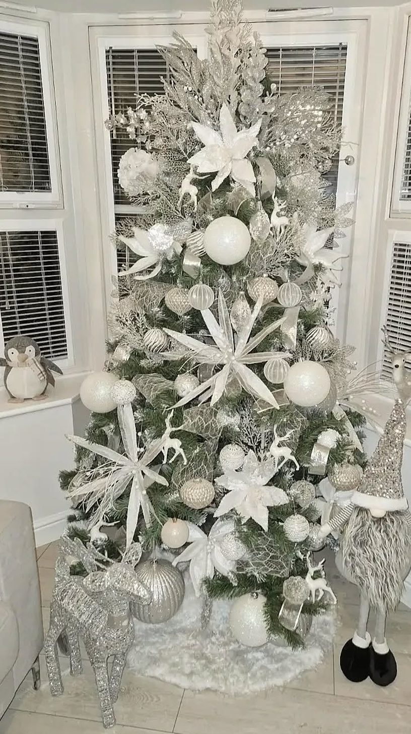 Massive white and silver starbursts immediately catch the eye, giving the tree a bold, icy elegance. They’re paired with oversized glittery white ornaments and shimmering reindeer figurines scattered throughout the greenery. Soft white poinsettias and frosted leaves enhance the wintry feel without overwhelming the design.