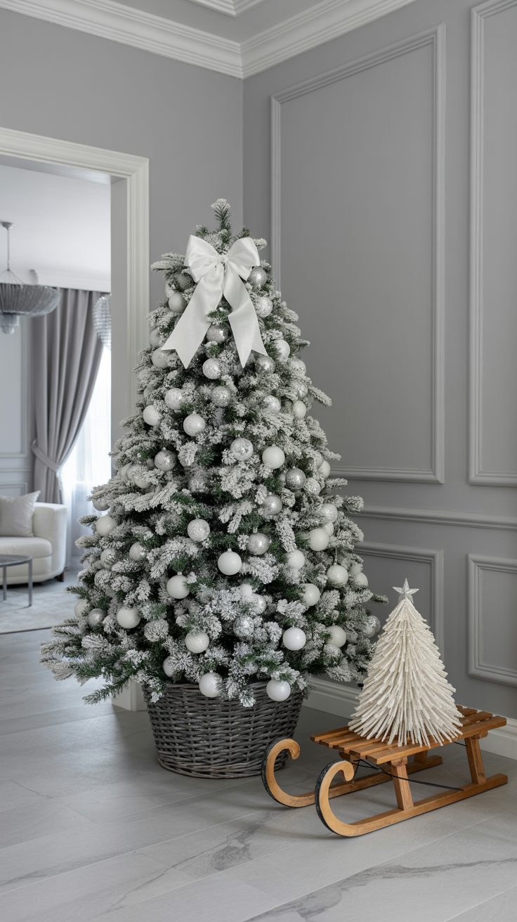 The tree is covered in frosted branches giving it a wintry, natural look. White and silver ornaments are evenly spaced, adding a clean and polished feel. A large white bow tops it off, tying the whole design together.