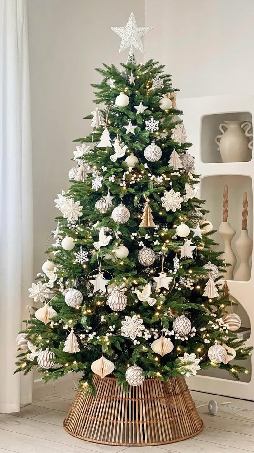 The ornaments are a mix of textured snowflakes, geometric baubles, and delicate stars. There are small wooden touches and paper decorations that add a natural feel. Everything feels coordinated yet effortless.