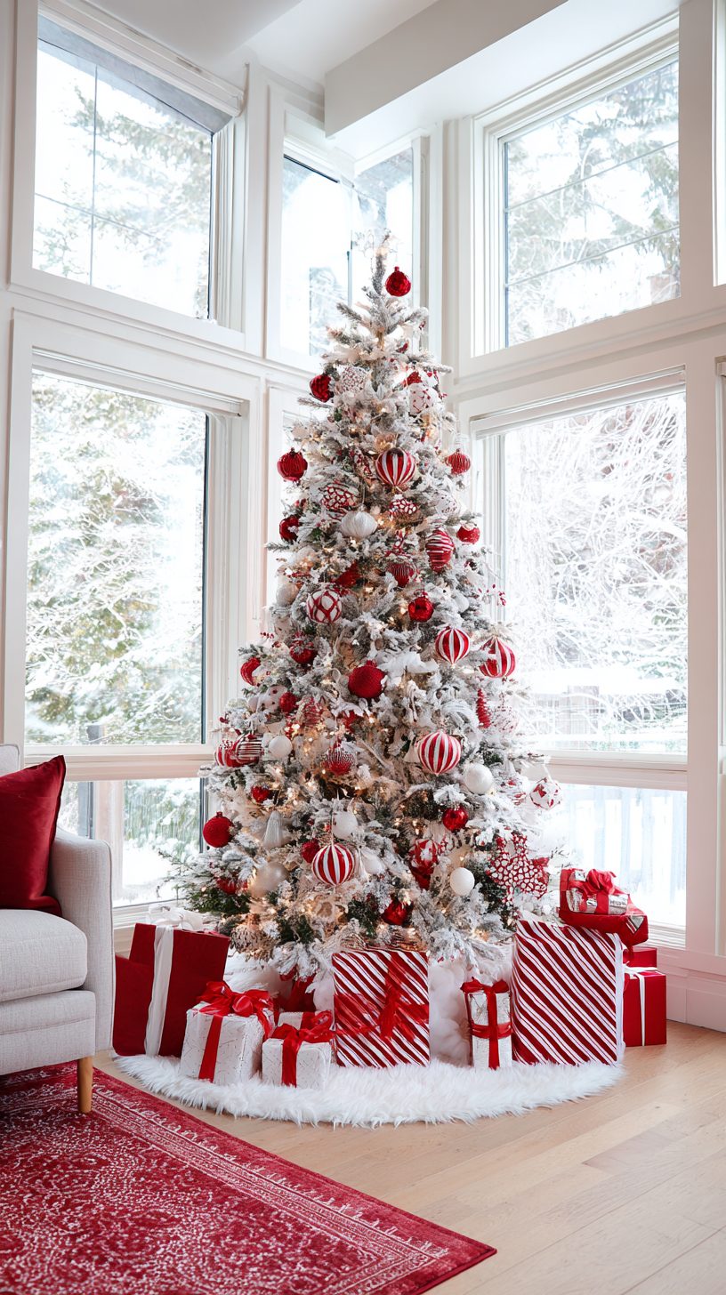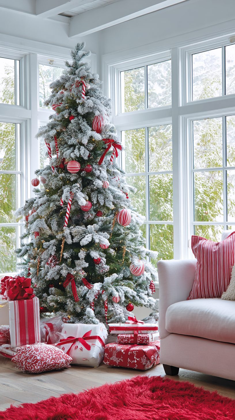 Soft white flocking coats the Christmas tree, giving it an icy, snow-dusted appearance. Bright red ornaments and candy-striped baubles pop against the snowy backdrop, creating a bold contrast that draws your attention immediately. White lights weave through the branches, adding warmth and a cozy glow to the chilly vibe of the décor.