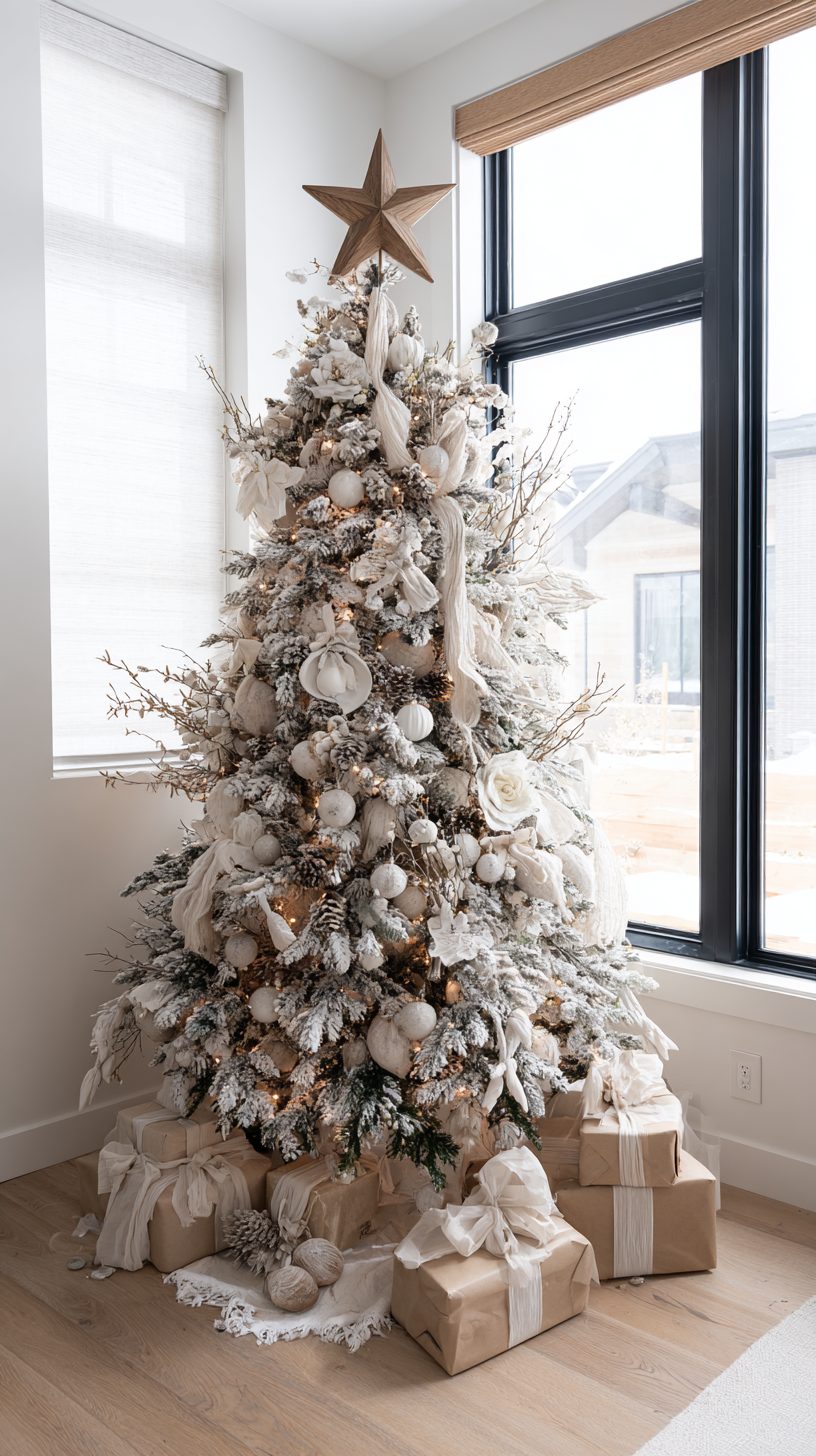 White branches dominate the tree, creating a frosted look that feels crisp and elegant. The soft glow of warm white lights brings depth to the icy tones, contrasting beautifully with the snowy effect. A glittering, light-filled star on top completes the classic holiday vibe.