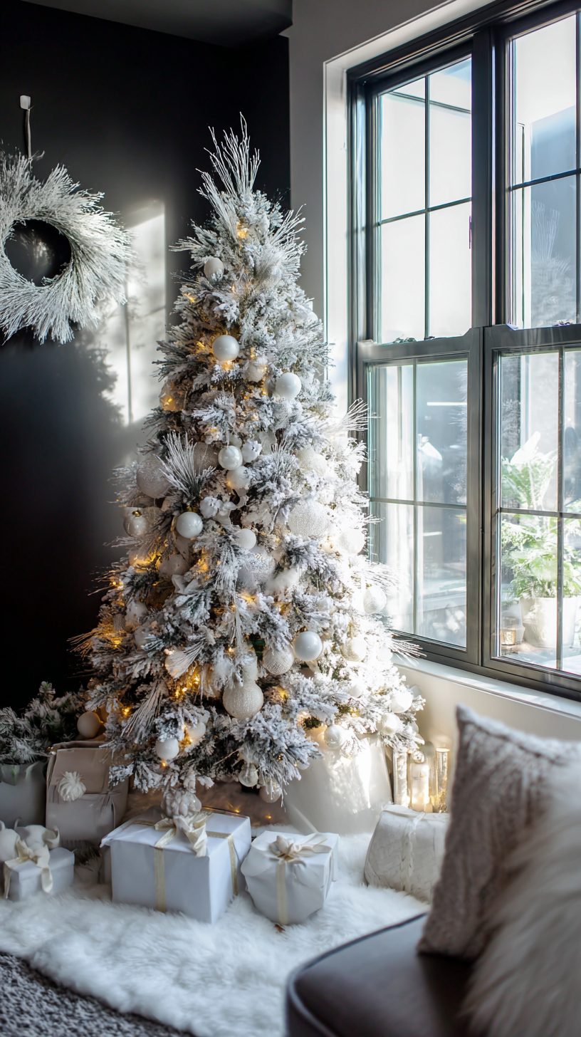 The black accent wall creates a striking backdrop, making the tree stand out even more. Nearby, a matching wreath continues the frosted, minimalist theme. The window lets in natural light, brightening the space and reflecting off the ornaments.