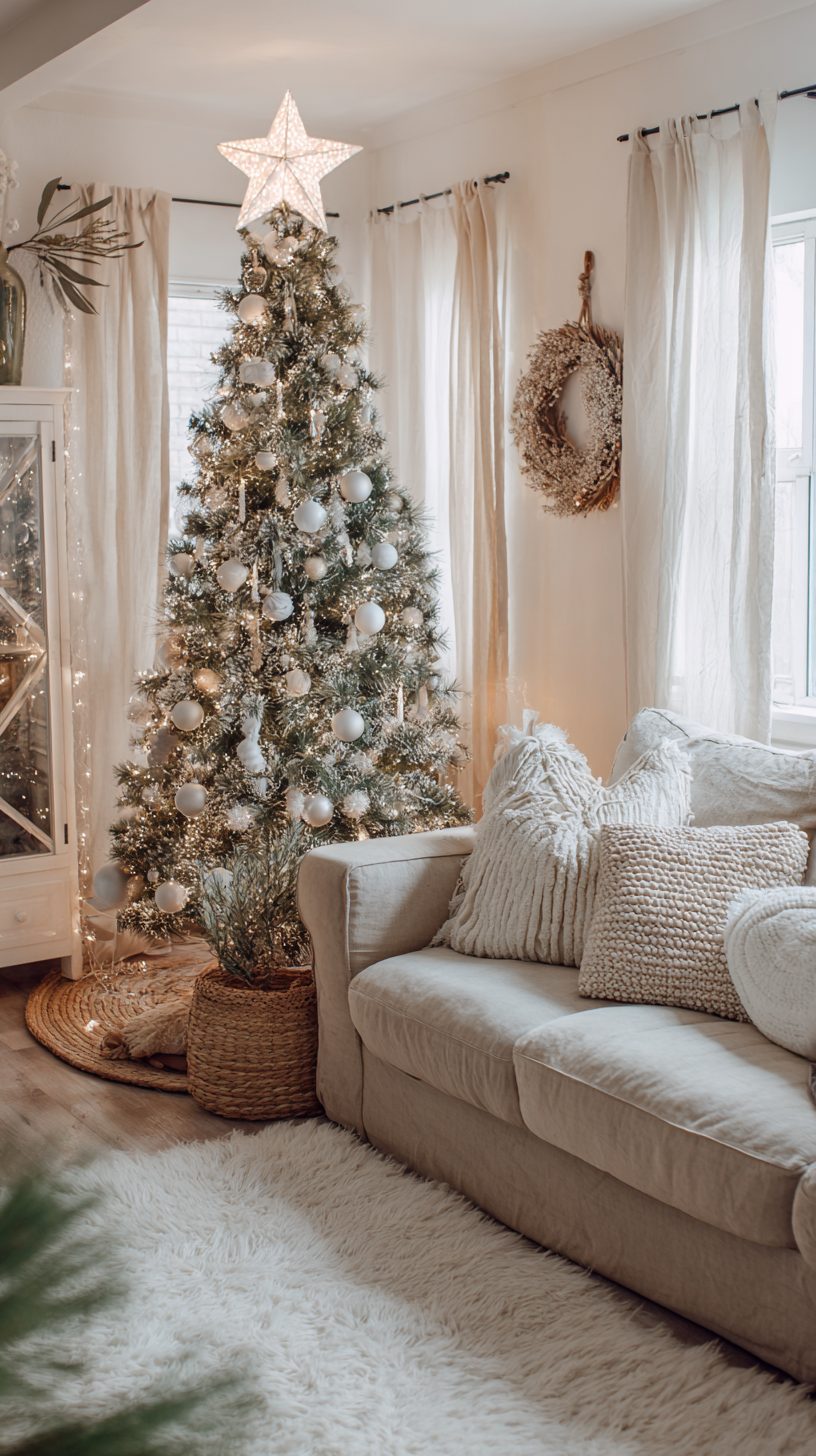 White curtains filter in soft daylight, creating an airy and serene vibe. A fluffy white rug spreads across the floor next to a taupe, oversized sofa piled with textured throw pillows. To the side, a simple wreath hangs on the wall while neutral décor—like a rustic cabinet and natural greenery—add understated charm to the setting. It’s a calm yet festive space that balances comfort with holiday cheer.