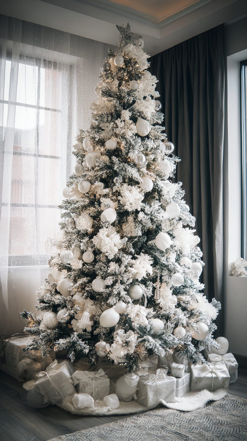 Wrapped gifts in white and silver add to the cohesive look. The tree sits near large windows, letting in soft daylight that enhances its snowy details. It’s classic with a modern finish, perfect for anyone who likes their holiday decor understated but elegant.