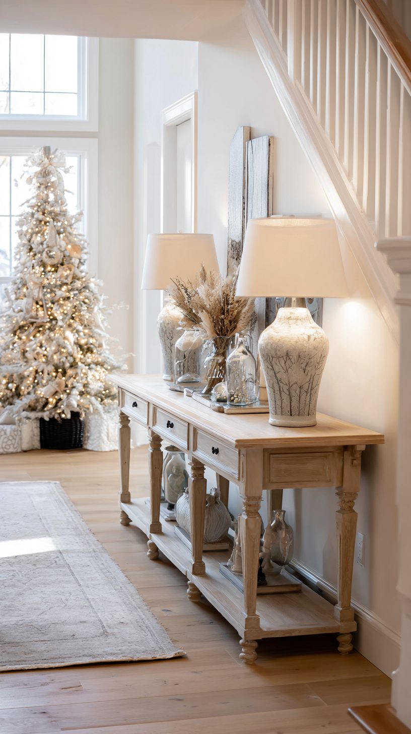 The console table is sturdy and warmly textured, with a light wood finish that matches the airy feel of the room. Two large lamps with tree-patterned bases add some subtle detail without taking over visually. A mix of dried grasses and ornaments in glass jars gives the display depth and organic interest.