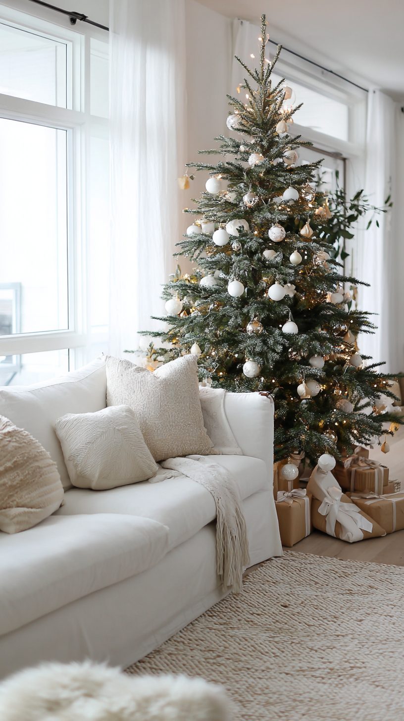 The Christmas tree stands tall with frosted branches, decked out in white ornaments and subtle gold accents. Warm white string lights wrap around it, giving just enough glow without being too bright. A neat stack of gift boxes in kraft paper and white ribbons lies at the base, keeping the look cohesive.